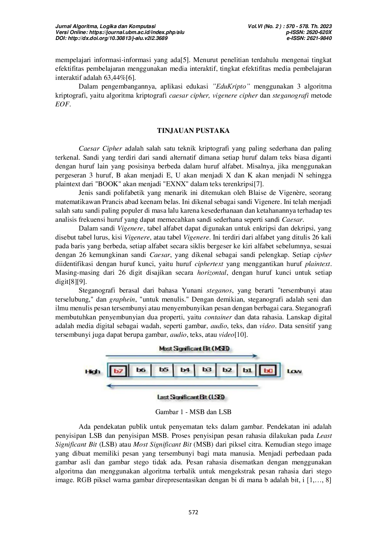 Jurnal Algoritma, Logika dan KomputasiJurnal Algoritma, Logika dan KomputasiKriptografi merupakan ilmu atau seni yang berguna untuk menjaga kerahasiaan surat dengan cara mengubah pesan menjadi bentuk yang tidak dipahami lagi (Simargolang, 2017). Banyak pelajar merasakan bahwa penyebaran informasi kriptografi yang disebarkan masih kurang efektif, dikarenakan masih banyak siswa yang tidak terlalu memahami kriptografi sehingga harus menjelajah internet, membaca buku, dll untuk mencari informasi tambahan. Tujuan dari penelitian ini adalah untuk membuat aplikasi yang bersifat efektif dan dapat menjadi media penyebaran informasi bagi mahasiswa mengenai kriptografi untuk mengembangkan tingkat pengetahuan kriptografi serta menyebarkan informasi tambahan mengenai kriptografi melalui aplikasi edukasi kriptografi. Teknik pengumpulan data yang dilakukan dalam penelitian ini yaitu dengan melakukan studi literatur dan pengumpulan data primer, Data yang digunakan didapat dari melakukan survey dengan menggunakan google form dan digunakan untuk menentukan keputusan dalam membuat aplikasi “EduKripto. Dengan tingginya tingkat keinginan siswa untuk mempelajari kriptografi, sebesar 41.2% peminat dan 11.8% tentatif , dapat disimpulkan bahwa aplikasi ini dapat membantu siswa dalam mempelajari kriptografi ditambah dengan tingkat akurasi aplikasi dalam menjalankan algoritma dan mendapatkan output yang tepat adalah 100% selama dilakukan uji coba pada aplikasi “EduKripto, serta data yang didapat mengindikasikan bahwa setelah menggunakan “EduKripto tingkat pemahaman mahasiswa dengan pemahaman kurang berubah dari 44.5%, 50% dan 72.2% menjadi 5.6%, 5.6% dan 22.2% dan tingkat pemahaman mahasiswa dengan pemahaman lebih dari rata-rata meningkat dari 55.5%,50% dan 27,8% menjadi 94.4%, 94.4% dan 77.8%, sehingga dapat disimpulkan bahwa penggunaan aplikasi “EduKripto dapat membantu dalam pengembangan tingkat pemahaman kriptografi.