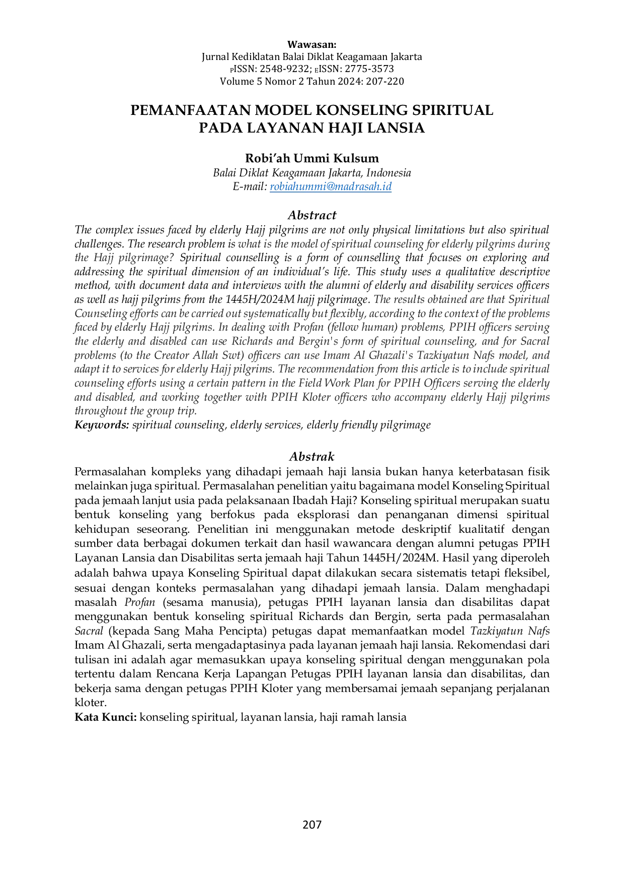 Upaya konseling spiritual sebenarnya telah dilakukan oleh Tim PPIH Layanan Lansia dan Disabilitas khususnya pada Ibadah Haji 1445H/2024M, tetapi belum terprogram secara nyata sebagai suatu wujud konseling spiritual.Tindak lanjut dari temuan ini adalah konseling spiritual dapat dilakukan secara sistematis tetapi fleksibel, sesuai dengan konteks permasalahan yang dihadapi jemaah lansia.Koseling spiritual dapat digunakan untuk memecahkan permasalahan baik profan (sesama manusia) maupun sacral (kepada Sang Pencipta).Konseling spiritual petugas PPIH layanan lansia dan disabilitas pada permasalahan profan dapat dilakukan dengan memanfaatkan konseling spiritual Richards dan Bergin serta mengadaptasinya pada layanan jemaah haji lansia, seperti dengan mengajak doa bersama.mengajarkan konsep-konsep beriman, taqwa, sabar, dan lainnya.referensi kitab suci, yaitu dengan membaca Al Quran maupun memahami maknanya.menasehati dan mengajak untuk memaafkan atau melapangkan dada dengan pemanfaatan kelompok beragama, seperti mengingat Sahabat, ajaran Rasulullah maupun para ulama.maupun mendorong lansia untuk memanfaatkan biblioterapi keagamaan, seperti membaca surat-surat yang biasa dibaca dalam Al Quran, membaca ratib, asmaul husna, dan lainnya.Sedangkan untuk permasalahan sacral, maka petugas PPIH layanan lansia dan disabilitas dapat merujuk pada konsep imam Al Ghazali tentang konseling spiritual penyucian jiwa (tazkiyatu an nafs), yaitu Takhali, Tahalli dan Tajalli.Tahap Takhali mengajak jemaah untuk mau merefleksikan diri, beristighfar, dan membersihkan diri dari kebiasaan dan sifat-sifat buruk lainnya.tahap keduanya Tahalli, yaitu mengembangkan potensi-potensi positif yang ada pada diri jamaah, serta membangun nilai-nilai kebaikan dan kebersamaan.tahap ketiga yaitu Tajalli, di mana jemaah telah mengenal dirinya dan mengagungkan Allah SangPencipta.