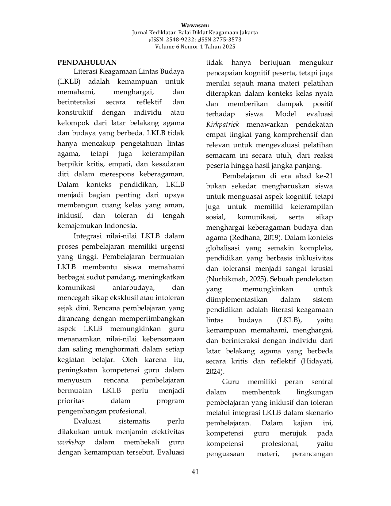 Wawasan: Jurnal Kediklatan Balai Diklat Keagamaan JakartaWawasan: Jurnal Kediklatan Balai Diklat Keagamaan JakartaPenelitian ini bertujuan untuk mengevaluasi efektivitas workshop peningkatan kemampuan penyusunan perencanaan pembelajaran bermuatan Literasi Keagamaan Lintas Budaya (LKLB) bagi guru‑guru di Kota Malang menggunakan model evaluasi Kirkpatrick. Metode penelitian yang digunakan adalah evaluatif dengan pendekatan mixed methods, mencakup empat level evaluasi Kirkpatrick: reaksi, pembelajaran, perilaku, dan hasil. Sumber data penelitian ini adalah 30 guru dari beberapa sekolah dan madrasah di Kota Malang yang dipilih melalui teknik purposive sampling, dengan kriteria pengalaman mengajar minimal tiga tahun dan keterlibatan dalam praktik pembelajaran berbasis keberagaman. Data dikumpulkan melalui pre-test dan post-test, observasi, wawancara, refleksi harian, serta survei siswa dan kepala sekolah. Hasil penelitian menunjukkan bahwa pada level reaksi, lebih dari 90% peserta merasa puas terhadap pelaksanaan workshop. Pada level pembelajaran, terjadi peningkatan signifikan dalam pemahaman konsep LKLB, dengan skor post-test yang jauh lebih tinggi dibandingkan pre-test (p < 0,05). Pada level perilaku, guru mulai mengimplementasikan pembelajaran inklusif berbasis LKLB di kelas. Sementara pada level hasil, siswa melaporkan suasana kelas yang lebih inklusif, menghargai perbedaan, dan partisipatif. Faktor pendukung keberhasilan workshop meliputi motivasi tinggi peserta dan desain pelatihan berbasis praktik reflektif, sedangkan kendala utama adalah keterbatasan waktu dan variasi kemampuan awal peserta.