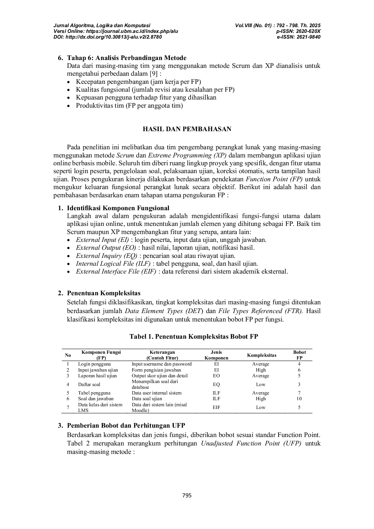 Jurnal Algoritma, Logika dan KomputasiJurnal Algoritma, Logika dan KomputasiPenelitian ini bertujuan untuk mengevaluasi efektivitas dua metode Agile, yaitu Scrum dan Extreme Programming (XP), dalam proses pengembangan aplikasi mobile ujian online. Dalam konteks kebutuhan sistem yang cepat, fleksibel, dan responsif terhadap perubahan, pendekatan pengembangan perangkat lunak berbasis Agile menjadi sangat relevan, khususnya untuk proyek-proyek berskala kecil hingga menengah. Penelitian ini menggunakan pendekatan studi kasus kualitatif yang diperkuat dengan data kuantitatif berupa analisis Function Point (FP) guna memberikan gambaran objektif mengenai produktivitas masing-masing metode. Hasil penelitian menunjukkan bahwa metode XP mampu menyelesaikan 85 Function Points dalam 120 jam kerja, dengan tingkat produktivitas sebesar 0,708 FP per jam. Sementara itu, Scrum menyelesaikan 75 Function Points dalam 110 jam kerja dengan produktivitas 0,682 FP per jam. Meskipun selisihnya tidak terlalu besar, data ini menunjukkan bahwa XP lebih efisien dalam menyelesaikan fungsi sistem per satuan waktu. Dari hasil observasi dan wawancara, XP juga dinilai lebih adaptif terhadap perubahan kebutuhan dan lebih mendorong kolaborasi teknis antar anggota tim, khususnya melalui praktik pair programming dan continuous refactoring. Di sisi lain, Scrum memberikan struktur kerja yang lebih sistematis melalui sprint planning dan backlog grooming. Dapat disimpulkan bahwa XP lebih efektif dalam konteks proyek yang membutuhkan kecepatan iterasi dan fleksibilitas tinggi, meskipun Scrum tetap unggul dalam hal pengelolaan tugas dan dokumentasi.