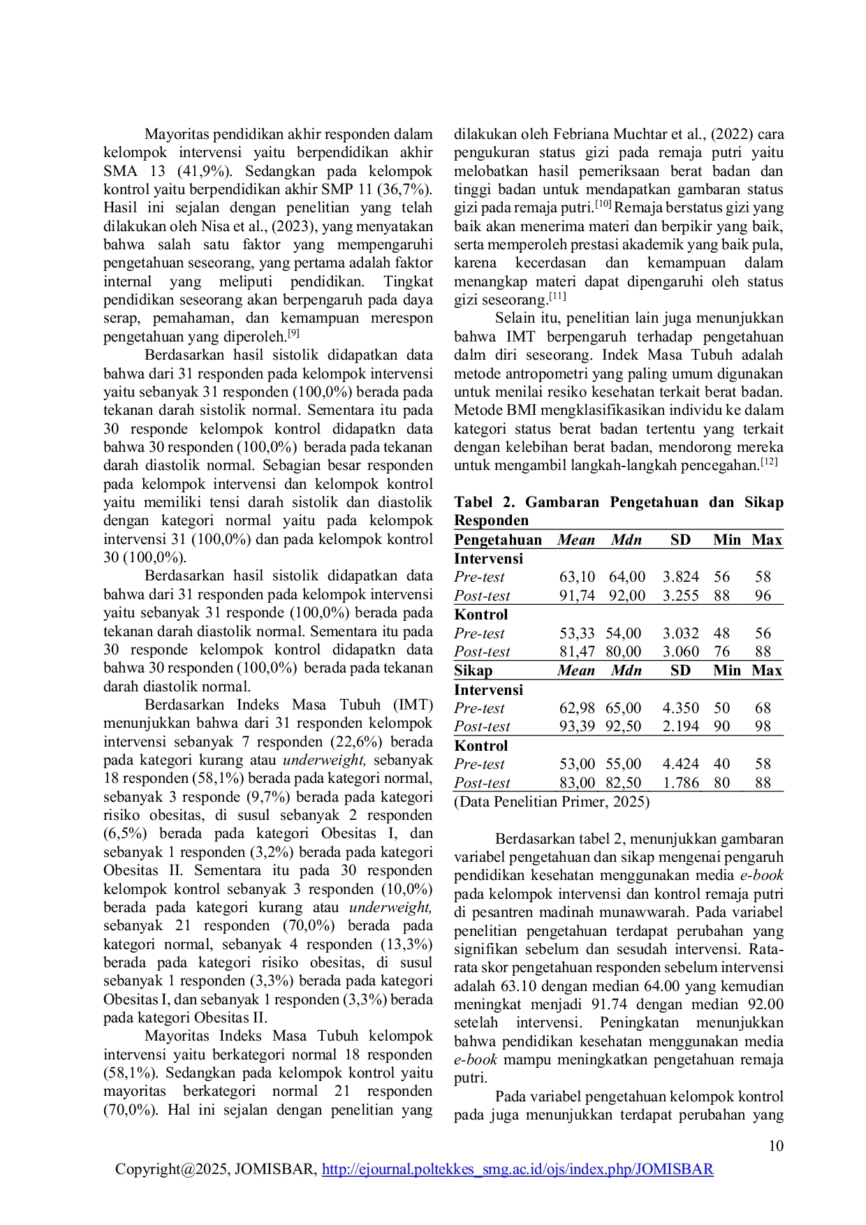 Penelitian ini menyimpulkan bahwa terdapat pengaruh signifikan pemberian media e-book terhadap pengetahuan dan sikap responden sebelum dan sesudah diberikan perlakuan dibandingkan dengan kelompok kontrol.Selain itu, terdapat perbedaan signifikan dalam peningkatan pengetahuan dan sikap mengenai anemia pada remaja putri setelah diberikan pendidikan kesehatan melalui media e-book dibandingkan pada kelompok kontrol yang diberikan melalui metode ceramah.Karakteristik responden menunjukkan usia terbanyak adalah remaja akhir dan tingkat pendidikan tertinggi adalah SMA.