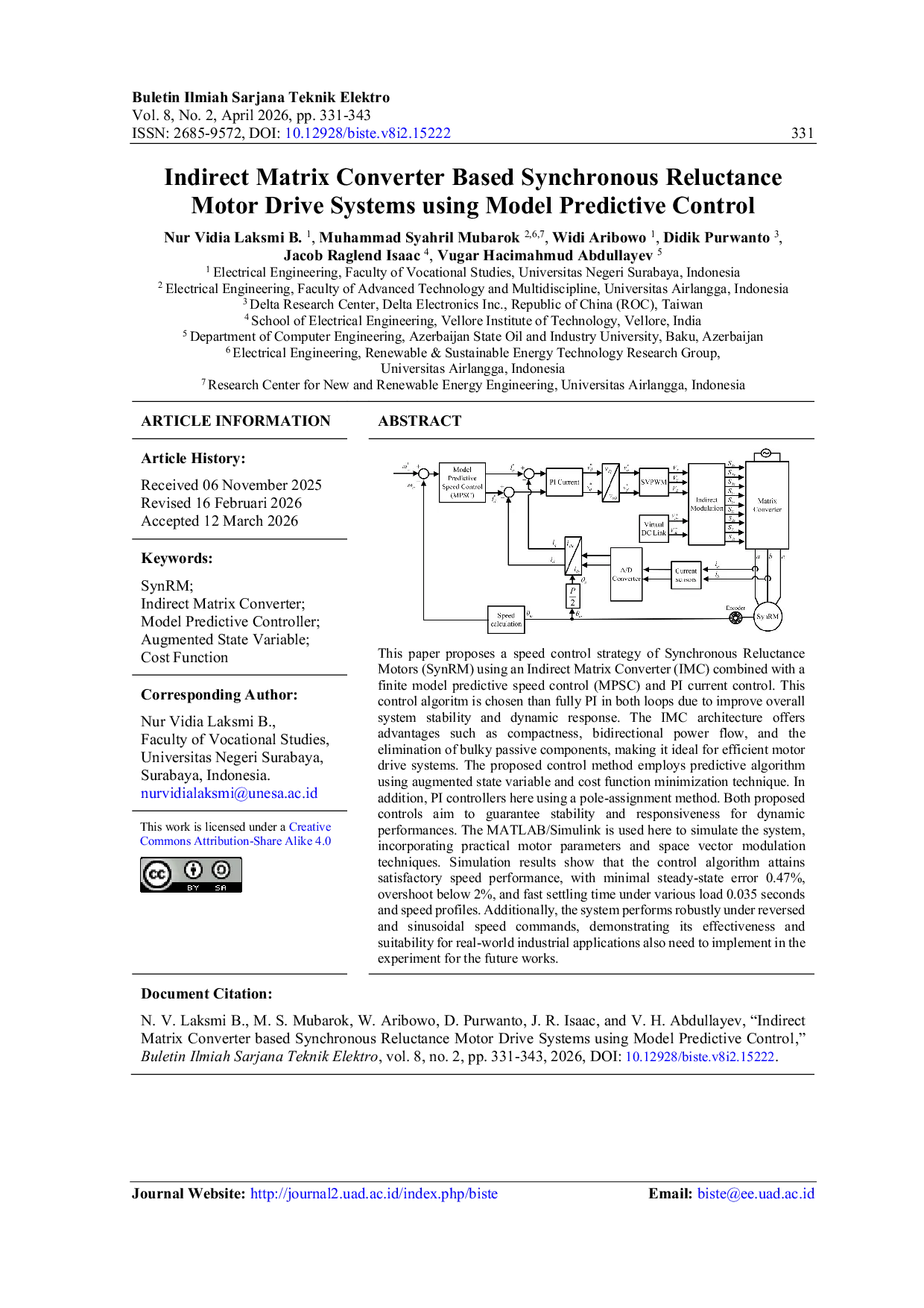 Buletin Ilmiah Sarjana Teknik ElektroBuletin Ilmiah Sarjana Teknik ElektroThis paper proposes a speed control strategy of Synchronous Reluctance Motors (SynRM) using an Indirect Matrix Converter (IMC) combined with a finite model predictive speed control (MPSC) and PI current control. This control algorithm is chosen rather than fully PI in both loops due to improve overall system stability and dynamic response. The IMC architecture offers advantages such as compactness, bidirectional power flow, and the elimination of bulky passive components, making it ideal for efficient motor drive systems. The proposed control method employs predictive algorithm using augmented state variable and cost function minimization technique. In addition, PI controllers here using a pole-assignment method. Both proposed controls aim to guarantee stability and responsiveness for dynamic performances. The MATLAB/Simulink is used here to simulate the system, incorporating practical motor parameters and space vector modulation techniques. Simulation results show that the control algorithm attains satisfactory speed performance, with minimal steady-state error 0.47%, overshoot below 2%, and fast settling time under various load 0.035 seconds and speed profiles. Additionally, the system performs robustly under reversed and sinusoidal speed commands, demonstrating its effectiveness and suitability for real-world industrial applications also need to implement in the experiment for the future works.