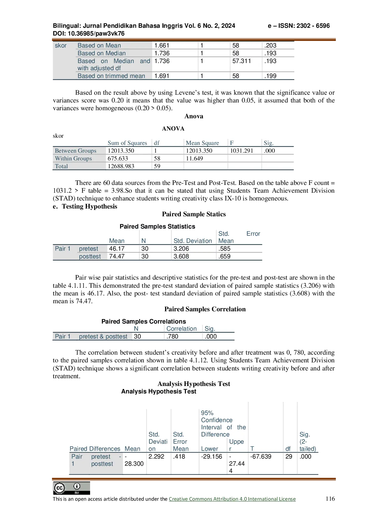 Berdasarkan hasil analisis data, penulis menemukan bahwa populasi penelitian adalah 300 siswa, dan sampel yang dipilih adalah 30 siswa dari kelas VII-10.Sebelum menggunakan teknik Student Team Achievement (STAD), nilai rata-rata siswa untuk data pre-test adalah 1385 dengan nilai rata-rata 46,17, sedangkan untuk data post-test adalah 2234 dengan nilai rata-rata 74,47.Hasil standar deviasi menunjukkan perbedaan yang signifikan dan membuktikan bahwa skor pre-test adalah 3,20, sedangkan skor post-test adalah 3,60.Dalam uji normalitas, penulis menemukan bahwa α = 0,05, dan data pre-test serta post-test terdistribusi secara normal, karena efek yang diperoleh untuk data post-test adalah 0,055, yang lebih besar dari 0,05.Hasil perhitungan menunjukkan bahwa semua nilai signifikan untuk kreativitas menulis siswa menggunakan teknik Student Team Achievement (STAD) adalah sama, yaitu α = 0,05, dengan nilai 0,055 > 0,05.Berdasarkan hasil analisis, Fhitung = 1031,2 > Ftabel = 3,98, sehingga dapat dikatakan bahwa penggunaan teknik Student Team Achievement Division (STAD) pada kelas VII-10 adalah homogen.Karena data homogen, pengujian hipotesis penelitian dilakukan menggunakan statistik parametrik, yaitu uji perbedaan dua rata-rata (t-test).Teknik Student Team Achievement Division (STAD) yang diberikan dapat meningkatkan kreativitas menulis siswa.Berdasarkan hasil analisis pengujian hipotesis, penulis mendapatkan bahwa nilai signifikansi = 0,00 (p < 0,05).Sehingga hipotesis (H0) ditolak dan hipotesis (H1) diterima secara otomatis.Hasil pre-test dan post-test mengalami perubahan yang signifikan.Berdasarkan bukti dari hasil penelitian, post-test memiliki skor yang lebih tinggi daripada pre-test.Berdasarkan statistik data di atas, kita mengetahui bahwa ada peningkatan yang nyata dalam skor sebelum dan setelah diberikan perlakuan dengan menggunakan teknik Student Team Achievement Division (STAD).Oleh karena itu, kita mengetahui bahwa penggunaan teknik Student Team Achievement Division (STAD) dapat digunakan sebagai teknik untuk meningkatkan kreativitas menulis siswa.