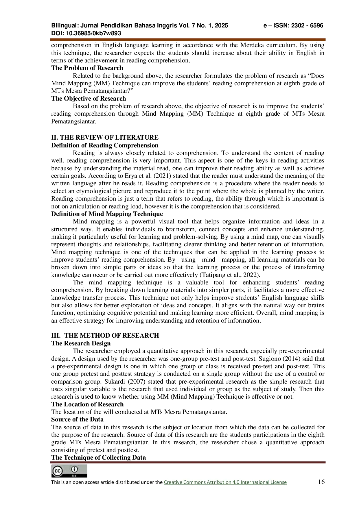 Bilingual : Jurnal Pendidikan Bahasa InggrisBilingual : Jurnal Pendidikan Bahasa InggrisTujuan penelitian ini adalah untuk meningkatkan pemahaman membaca siswa melalui penerapan Teknik Mind Mapping pada kelas VIII MTs Mesra Pematangsiantar. Penelitian ini menggunakan pendekatan kuantitatif dengan desain pre-eksperimental, yaitu desain pre-test dan post-test satu kelompok. Populasi penelitian ini adalah seluruh siswa kelas VIII yang berjumlah 307 siswa, dan sampelnya adalah kelas VIII-2 dengan total 32 siswa yang dipilih melalui sampling purposive. Pengumpulan data dilakukan dengan memberikan pre-test dan post-test dalam bentuk soal pilihan ganda. Data dianalisis menggunakan SPSS versi 26.0, termasuk distribusi frekuensi, analisis statistik, uji normalitas, uji homogenitas, dan uji hipotesis. Hasil menunjukkan adanya perbedaan yang signifikan antara skor pre-test dan post-test siswa setelah menerapkan Teknik Mind Mapping. Hasil penelitian menunjukkan Ttest (10,486) > Ttable (1,668) pada tingkat signifikansi α = 0,05 dengan derajat kebebasan (df) = (32-1=31) untuk satu kelas sehingga derajat kebebasan dalam kelompok adalah 62. Skor rata-rata siswa meningkat dari 51,56 pada pre-test menjadi 70,31 pada post-test. Pada pre-test, hanya 4 siswa yang memenuhi kriteria ketuntasan minimal, sedangkan setelah pengobatan, 15 siswa mencapai skor di atas kriteria minimal. Ini berarti H0 ditolak dan Ha diterima. Berdasarkan bukti dari hasil penelitian, post-test memiliki skor yang lebih tinggi daripada pre-test. Dari hasil ini, disimpulkan bahwa ada perbedaan yang signifikan dalam meningkatkan pemahaman membaca siswa sebelum dan setelah diberikan pengobatan menggunakan Teknik Mind Mapping sebagai teknik pembelajaran. Oleh karena itu, dapat disimpulkan bahwa penggunaan Teknik Mind Mapping secara signifikan meningkatkan pemahaman membaca siswa pada kelas VIII MTs Mesra Pematangsiantar.