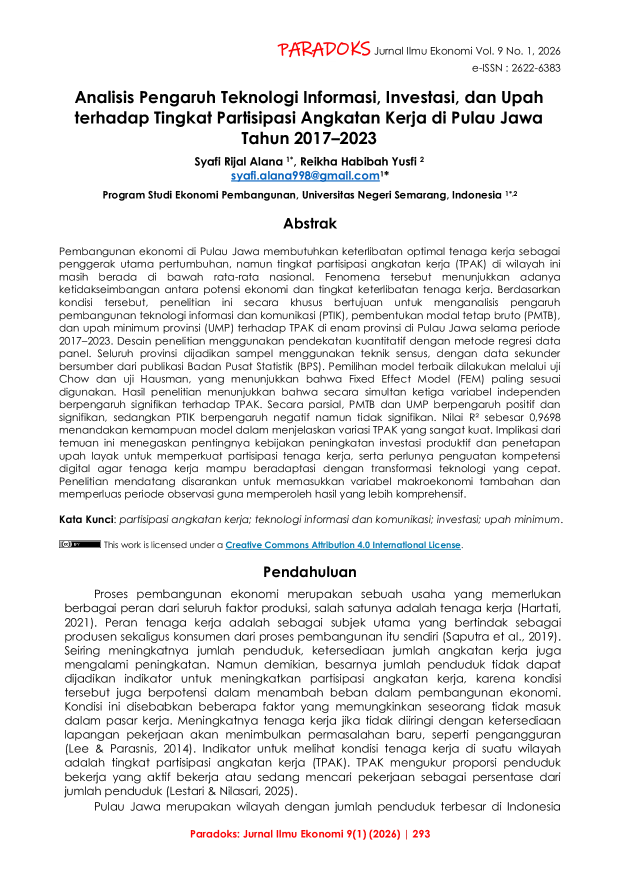 Paradoks : Jurnal Ilmu EkonomiParadoks : Jurnal Ilmu EkonomiPembangunan ekonomi di Pulau Jawa membutuhkan keterlibatan optimal tenaga kerja sebagai penggerak utama pertumbuhan, namun tingkat partisipasi angkatan kerja (TPAK) di wilayah ini masih berada di bawah rata-rata nasional. Fenomena tersebut menunjukkan adanya ketidakseimbangan antara potensi ekonomi dan tingkat keterlibatan tenaga kerja. Penelitian ini bertujuan untuk menganalisis pengaruh pembangunan teknologi informasi dan komunikasi (PTIK), pembentukan modal tetap bruto (PMTB), dan upah minimum provinsi (UMP) terhadap TPAK di enam provinsi di Pulau Jawa selama periode 2017–2023. Desain penelitian menggunakan pendekatan kuantitatif dengan metode regresi data panel. Seluruh provinsi dijadikan sampel menggunakan teknik sensus, dengan data sekunder bersumber dari publikasi Badan Pusat Statistik (BPS). Pemilihan model terbaik dilakukan melalui uji Chow dan uji Hausman, yang menunjukkan bahwa Fixed Effect Model (FEM) paling sesuai digunakan. Hasil penelitian menunjukkan bahwa secara simultan ketiga variabel independen berpengaruh signifikan terhadap TPAK. Secara parsial, PMTB dan UMP berpengaruh positif dan signifikan, sedangkan PTIK berpengaruh negatif namun tidak signifikan. Nilai R² sebesar 0,9698 menandakan kemampuan model dalam menjelaskan variasi TPAK yang sangat kuat. Implikasi dari temuan ini menegaskan pentingnya kebijakan peningkatan investasi produktif dan penetapan upah layak untuk memperkuat partisipasi tenaga kerja, serta perlunya penguatan kompetensi digital agar tenaga kerja mampu beradaptasi dengan transformasi teknologi yang cepat.