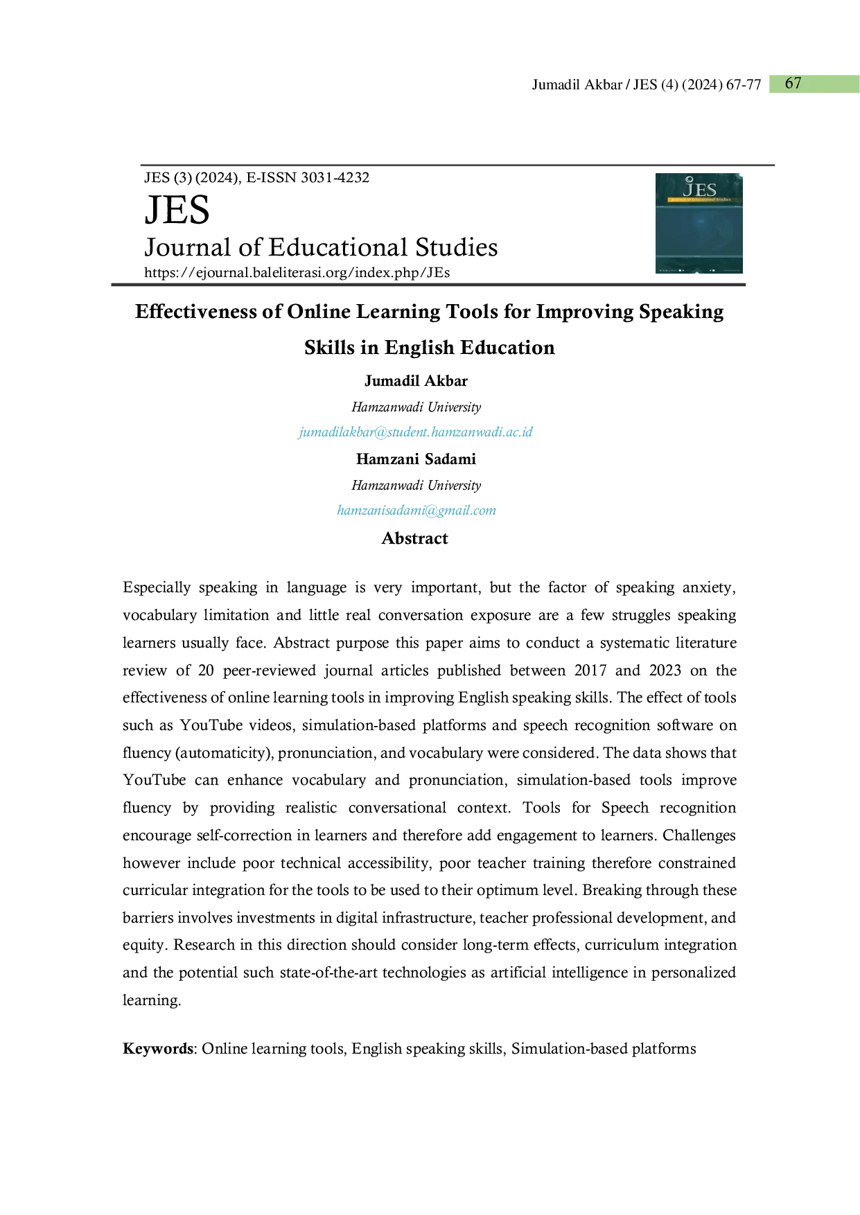 Journal of Educational StudiesJournal of Educational StudiesEspecially speaking in language is very important, but the factor of speaking anxiety, vocabulary limitation and little real conversation exposure are a few struggles speaking learners usually face. This paper aims to conduct a systematic literature review of 20 peer-reviewed journal articles published between 2017 and 2023 on the effectiveness of online learning tools in improving English speaking skills. The effect of tools such as YouTube videos, simulation-based platforms and speech recognition software on fluency (automaticity), pronunciation, and vocabulary were considered. The data shows that YouTube can enhance vocabulary and pronunciation, simulation-based tools improve fluency by providing realistic conversational context. Tools for Speech recognition encourage self-correction in learners and therefore add engagement to learners. Challenges however include poor technical accessibility, poor teacher training therefore constrained curricular integration for the tools to be used to their optimum level. Breaking through these barriers involves investments in digital infrastructure, teacher professional development, and equity. Research in this direction should consider long-term effects, curriculum integration and the potential such state-of-the-art technologies as artificial intelligence in personalized learning.