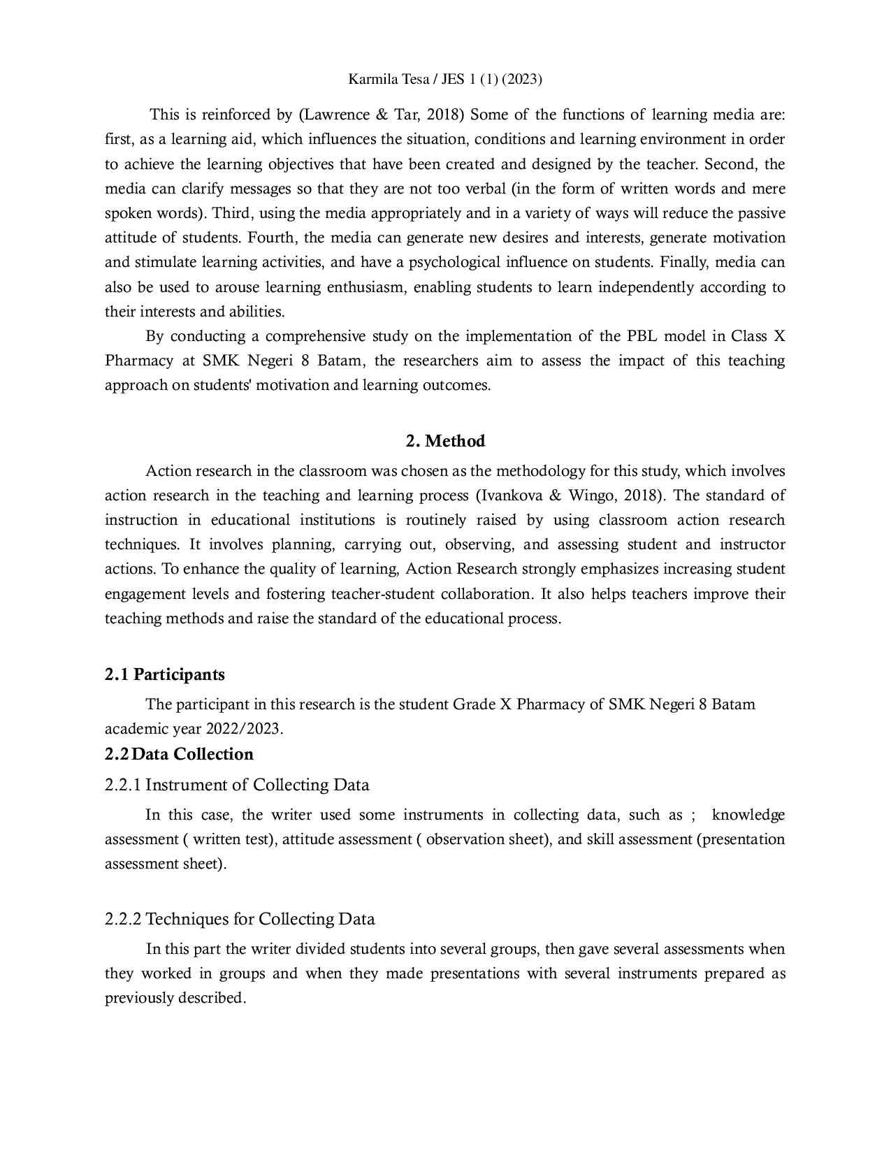 Journal of Educational StudiesJournal of Educational StudiesModel pembelajaran sangat penting dalam mendukung keberhasilan proses belajar mengajar; oleh karena itu guru sebagai pendidik harus menguasai dan memahami model pembelajaran yang tepat dengan karakter siswa. Penulis dalam hal ini sebagai guru menerapkan model pembelajaran Problem Based Learning (PBL) dalam mengajar Bahasa Inggris di kelas X Farmasi karena penulis menyadari bahwa model ini sangat sesuai dengan karakter siswa. Dengan menggunakan model ini, siswa menjadi lebih antusias dan aktif dalam proses belajar.
