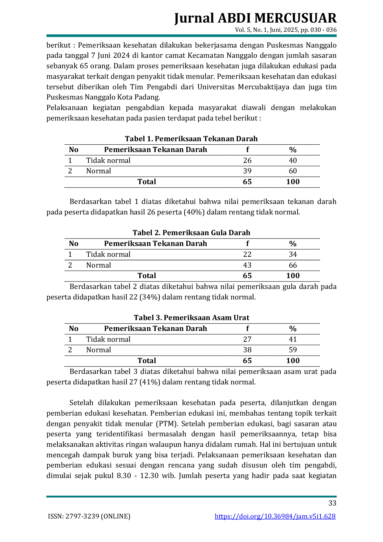 JURNAL ABDI MERCUSUARJURNAL ABDI MERCUSUARLatar Belakang: Penyakit tidak menular seperti hipertensi, asam urat, diabetes mellitus, dan kolesterol merupakan masalah kesehatan serius yang jika tidak ditangani sejak dini dapat menimbulkan komplikasi. Pemeriksaan kesehatan berkala penting untuk mendeteksi potensi penyakit lebih cepat. Metode: Penelitian ini menggunakan metode pengabdian masyarakat dengan melakukan pemeriksaan kesehatan di Kantor Camat Nanggalo Kota Padang, berkolaborasi dengan Puskesmas Nanggalo. Hasil: Sebanyak 65 peserta mendapatkan pemeriksaan kesehatan dan edukasi mengenai penyakit tidak menular.
