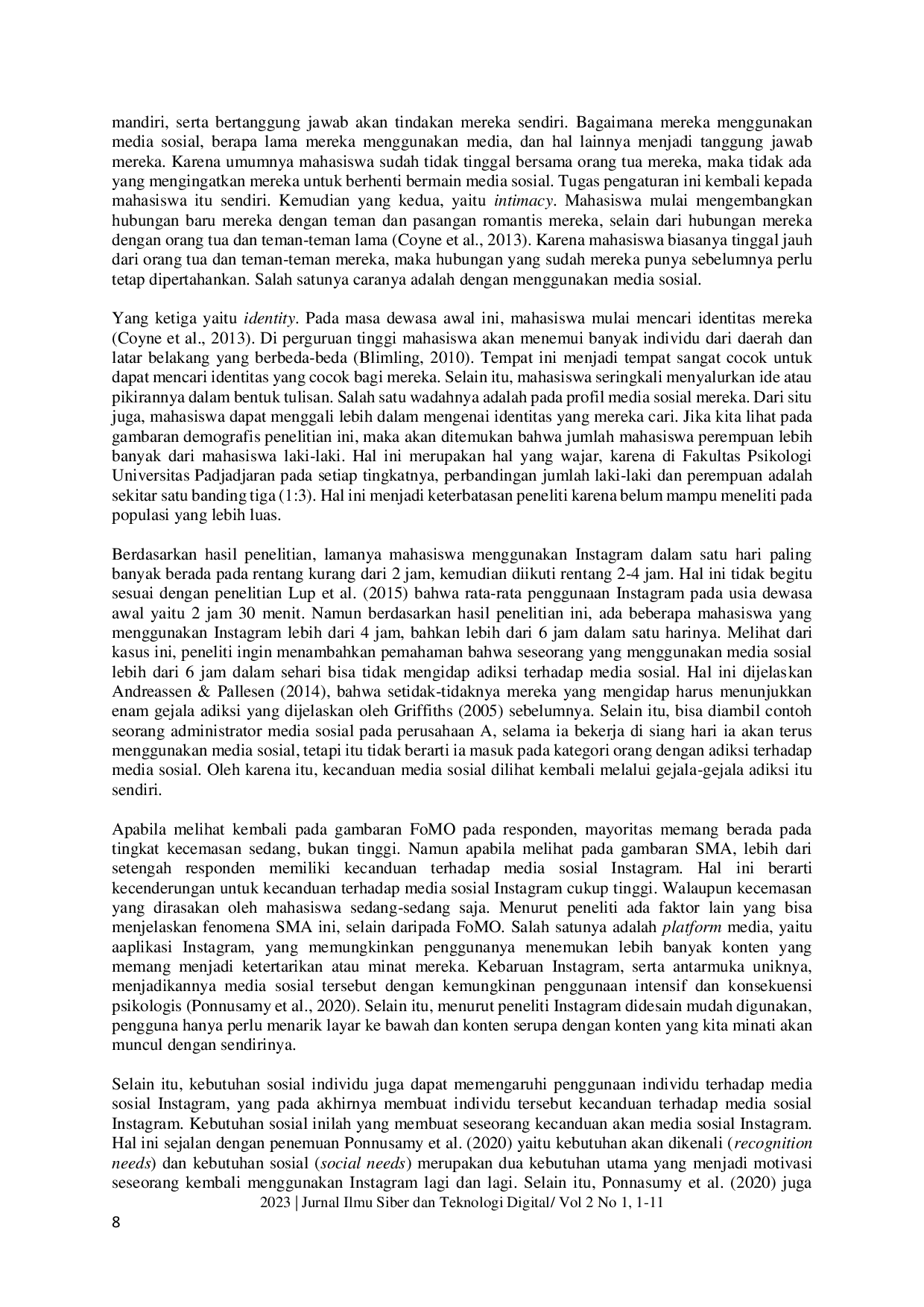 Dalam penelitian ini, terdapat dua variabel yang diukur, yaitu Fear of Missing Out (FoMO) dan Social Media Addiction (SMA) pada mahasiswa.Peneliti bertujuan untuk melihat hubungan fear of missing out dengan social media addiction pada mahasiswa Fakultas Psikologi Universitas Padjadjaran pengguna Instagram.Berdasarkan hasil analisis, kesimpulan yang diperoleh adalah.34% responden memiliki tingkat fear of missing out sedang, yang berarti lebih dari setengah responden kecanduan terhadap media sosial Instagram pada tingkat kecanduan sedang.Fear of missing out memiliki korelasi positif dengan kecanduan media sosial (social media addiction) Instagram.Setelah dilakukan uji korelasi Speraman, didapatkan hasil yaitu terdapat hubungan yang signifikan antara fear of missing out dengan social media addiction (r =.Hal ini berarti semakin tinggi kecemasan (FoMO) yang dirasakan individu akan semakin tinggi pula kecanduan (SMA) terhadap media sosial Instagram.
