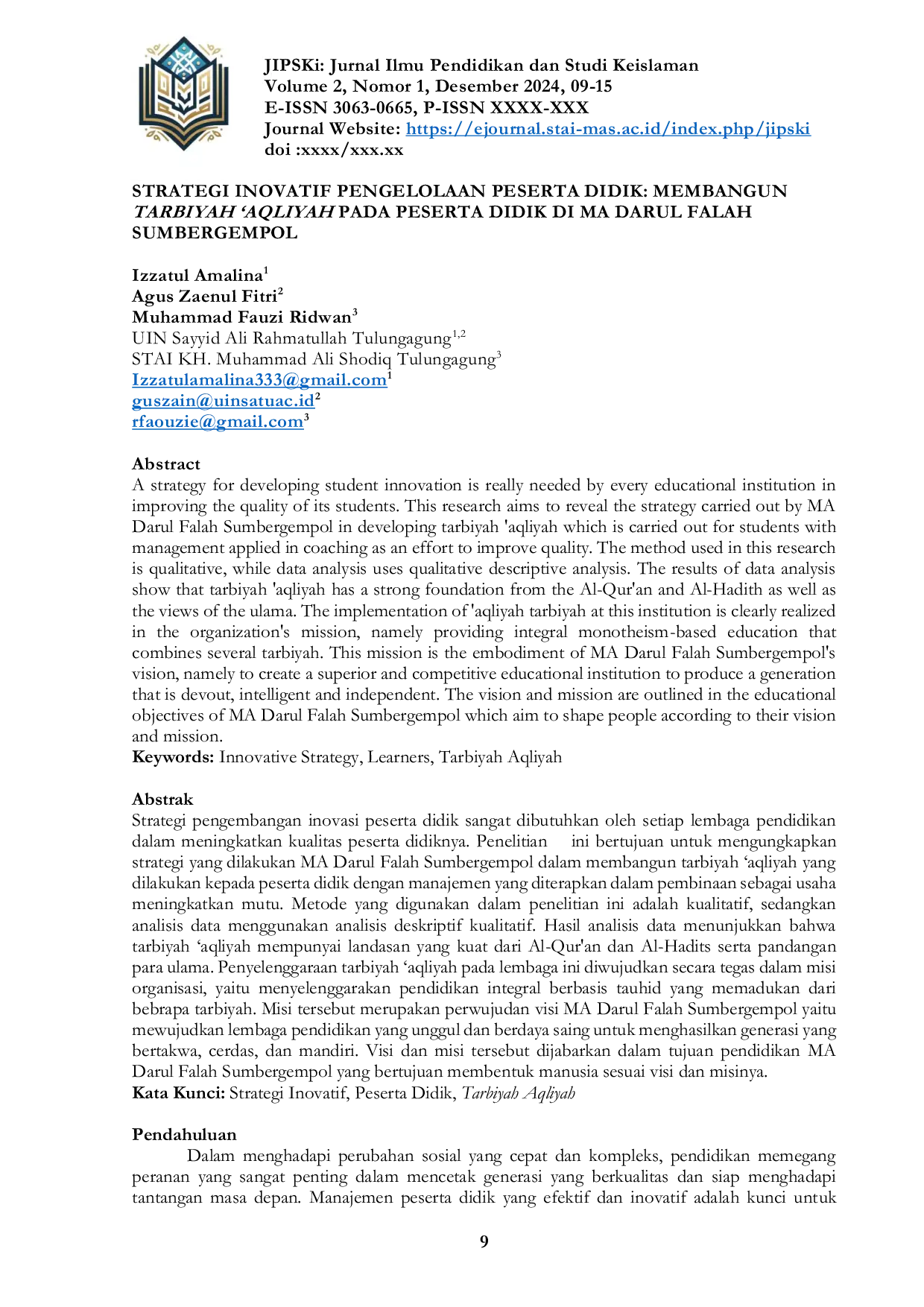 JIPSKi: Jurnal Ilmu Pendidikan dan Studi KeislamanJIPSKi: Jurnal Ilmu Pendidikan dan Studi KeislamanStrategi pengembangan inovasi peserta didik sangat dibutuhkan oleh setiap lembaga pendidikan dalam meningkatkan kualitas peserta didiknya. Penelitian ini bertujuan untuk mengungkapkan strategi yang dilakukan MA Darul Falah Sumbergempol dalam membangun tarbiyah aqliyah yang dilakukan kepada peserta didik dengan manajemen yang diterapkan dalam pembinaan sebagai usaha meningkatkan mutu. Metode yang digunakan dalam penelitian ini adalah kualitatif, sedangkan analisis data menggunakan analisis deskriptif kualitatif. Hasil analisis data menunjukkan bahwa tarbiyah aqliyah mempunyai landasan yang kuat dari Al-Quran dan Al-Hadits serta pandangan para ulama. Penyelenggaraan tarbiyah aqliyah pada lembaga ini diwujudkan secara tegas dalam misi organisasi, yaitu menyelenggarakan pendidikan integral berbasis tauhid yang memadukan dari bebrapa tarbiyah. Misi tersebut merupakan perwujudan visi MA Darul Falah Sumbergempol yaitu mewujudkan lembaga pendidikan yang unggul dan berdaya saing untuk menghasilkan generasi yang bertakwa, cerdas, dan mandiri. Visi dan misi tersebut dijabarkan dalam tujuan pendidikan MA Darul Falah Sumbergempol yang bertujuan membentuk manusia sesuai visi dan misinya.