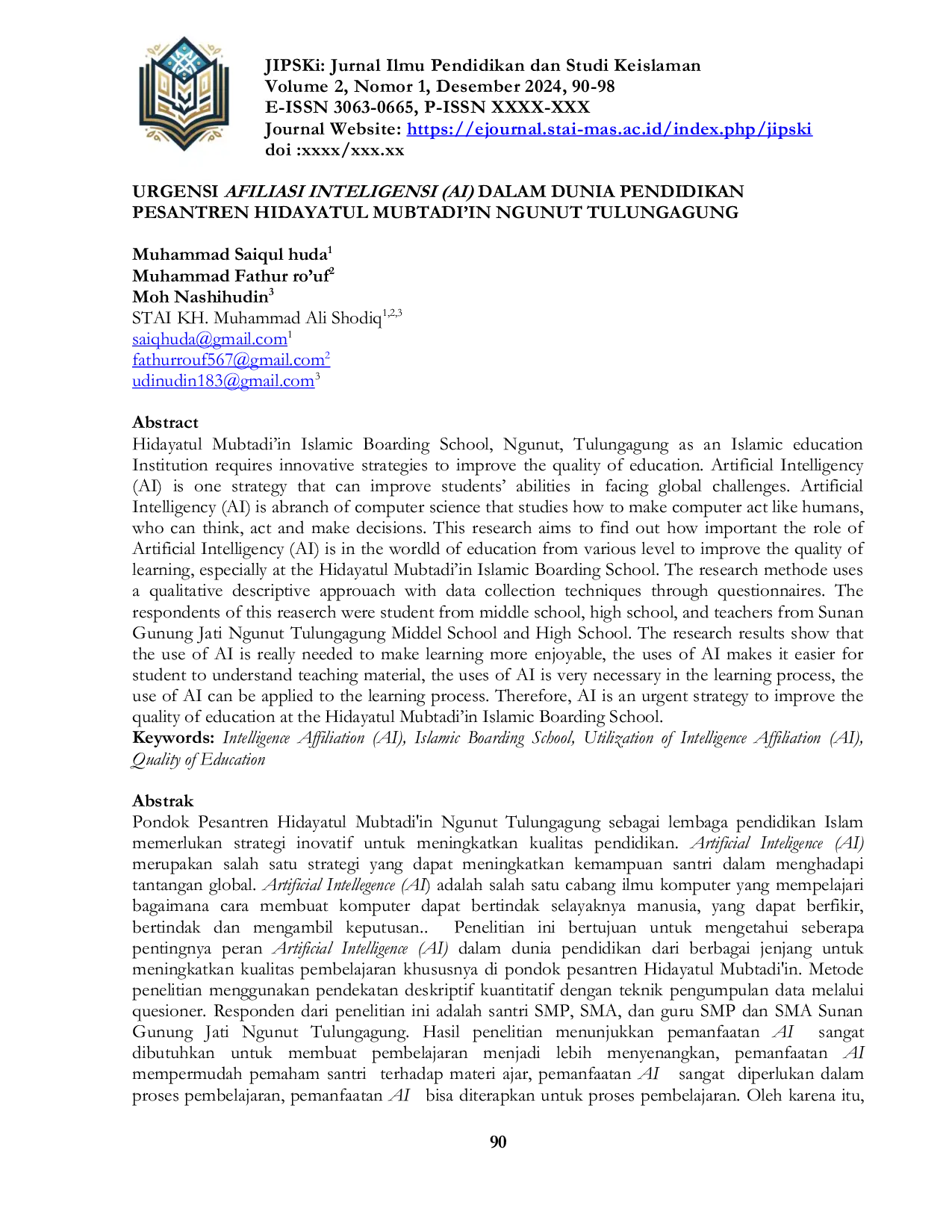 JIPSKi: Jurnal Ilmu Pendidikan dan Studi KeislamanJIPSKi: Jurnal Ilmu Pendidikan dan Studi KeislamanPondok Pesantren Hidayatul Mubtadiin Ngunut Tulungagung sebagai lembaga pendidikan Islam memerlukan strategi inovatif untuk meningkatkan kualitas pendidikan. Artificial Intellegence (AI) adalah salah satu cabang ilmu komputer yang mempelajari bagaimana cara membuat komputer dapat bertindak selayaknya manusia, yang dapat berfikir, bertindak dan mengambil keputusan. Penelitian ini bertujuan untuk mengetahui seberapa pentingnya peran Artificial Intelligence (AI) dalam dunia pendidikan dari berbagai jenjang untuk meningkatkan kualitas pembelajaran khususnya di pondok pesantren Hidayatul Mubtadiin. Metode penelitian menggunakan pendekatan deskriptif kuantitatif dengan teknik pengumpulan data melalui quesioner. Responden dari penelitian ini adalah santri SMP, SMA, dan guru SMP dan SMA Sunan Gunung Jati Ngunut Tulungagung. Hasil penelitian menunjukkan pemanfaatan AI sangat dibutuhkan untuk membuat pembelajaran menjadi lebih menyenangkan, pemanfaatan AI mempermudah pemahaman santri terhadap materi ajar, pemanfaatan AI sangat diperlukan dalam proses pembelajaran, pemanfaatan AI bisa diterapkan untuk proses pembelajaran. Oleh karena itu, Artificial Intelligence (AI) merupakan strategi yang urgent untuk meningkatkan kualitas pendidikan di Pondok Pesantren Hidayatul Mubtadiin.