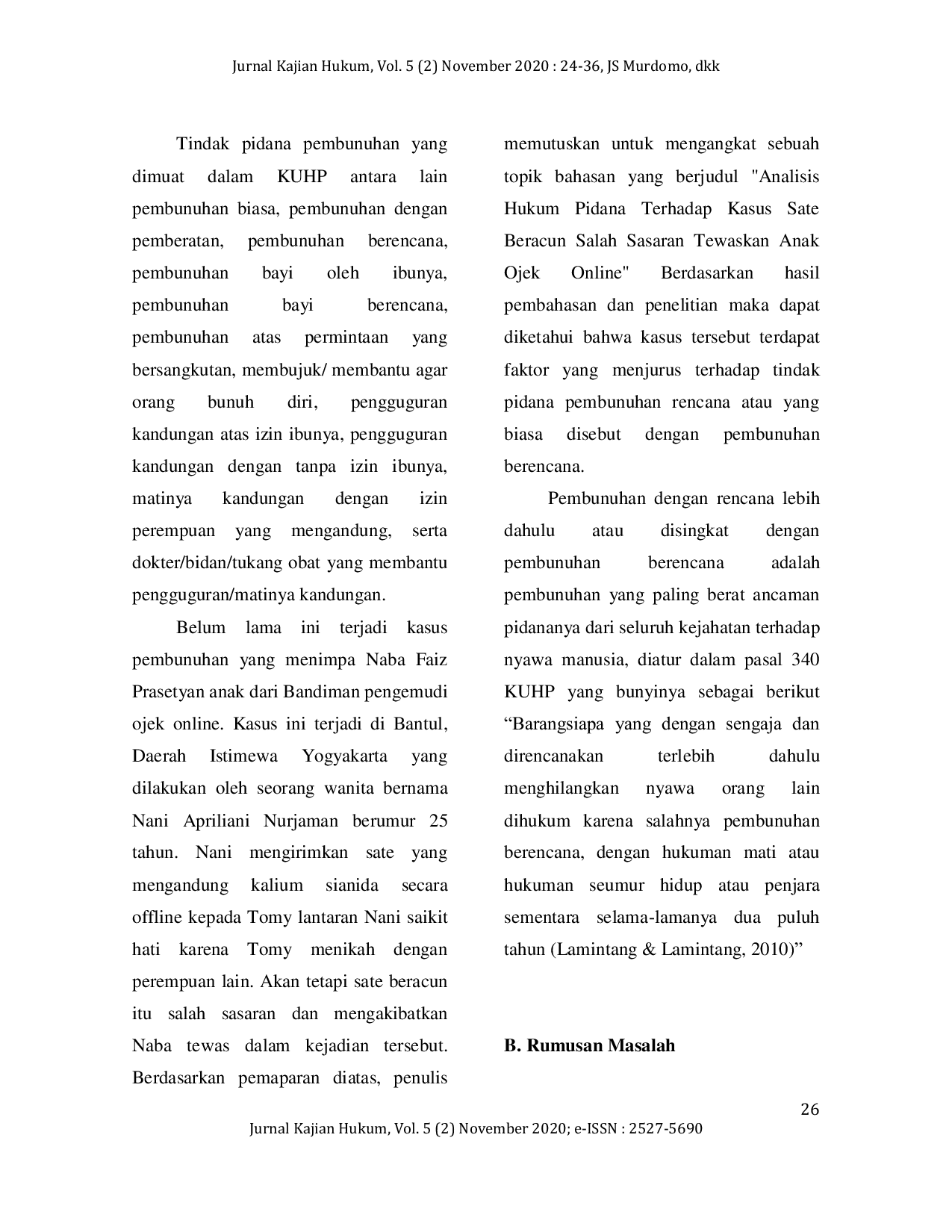 Jurnal Kajian HukumJurnal Kajian HukumPenelitian hukum ini bertujuan untuk menentukan faktor di balik adanya kasus sate beracun yang menewaskan anak ojek online, untuk mengetahui pertimbangan dalam menjatuhkan vonis pidana terhadap pelaku dan apa hak yang harus diperoleh oleh keluarga korban. Metode penelitian yang digunakan dalam penelitian ini adalah juridikal normatif. Berdasarkan hasil pembahasan dan penelitian, dapat dilihat bahwa dalam kasus ini terdapat faktor yang mengarah pada tindak pidana pembunuhan. Faktor di balik kasus sate beracun yang menewaskan anak ojek online, yaitu pelaku merasa tersakiti dan kecewa karena target menikah dengan wanita lain, sehingga ia merencanakan untuk mengirimkan sate yang mengandung kalium sianida (KCN) kepada target. Namun, sate beracun tersebut salah sasaran dan akhirnya membunuh anak ojek online. Berdasarkan penjelasan di atas, pelaku dapat dijerat dengan Pasal Pembunuhan yang Direncanakan karena telah memenuhi unsur-unsur yang ada. Meskipun perencanaan pembunuhan oleh pelaku tidak menargetkan target, pelaku dapat dijerat dengan Pasal 340 Kitab Undang-Undang Hukum Pidana dengan ancaman hukuman mati atau seumur hidup atau penjara selama-lamanya 20 tahun.