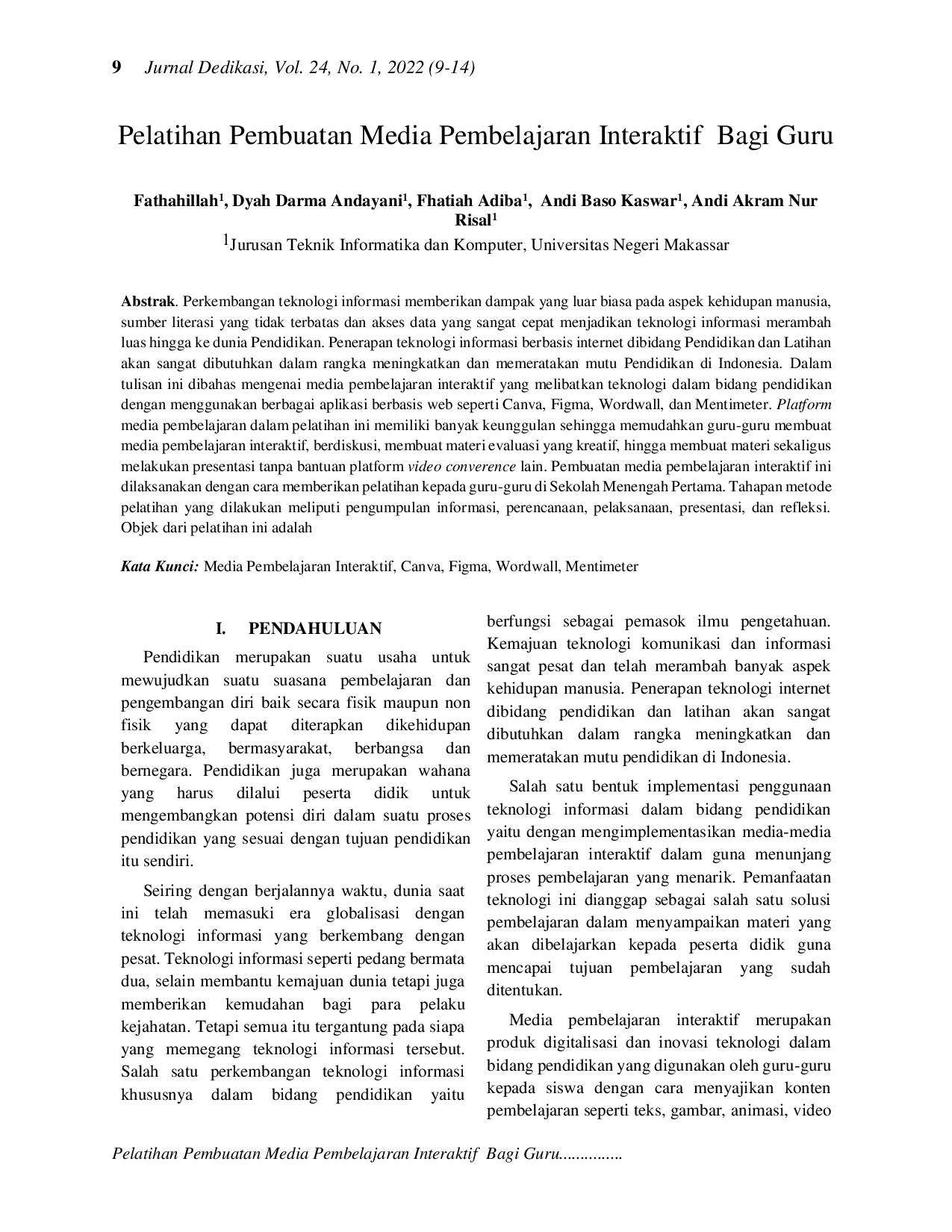 DEDIKASIDEDIKASIPerkembangan teknologi informasi memberikan dampak yang luar biasa pada aspek kehidupan manusia, sumber literasi yang tidak terbatas dan akses data yang sangat cepat menjadikan teknologi informasi merambah luas hingga ke dunia Pendidikan. Penerapan teknologi informasi berbasis internet di bidang Pendidikan dan Latihan akan sangat dibutuhkan dalam rangka meningkatkan dan memeratakan mutu Pendidikan di Indonesia. Dalam tulisan ini dibahas mengenai media pembelajaran interaktif yang melibatkan teknologi dalam bidang pendidikan dengan menggunakan berbagai aplikasi berbasis web seperti Canva, Figma, Wordwall, dan Mentimeter. Platform media pembelajaran dalam pelatihan ini memiliki banyak keunggulan sehingga memudahkan guru-guru membuat media pembelajaran interaktif, berdiskusi, membuat materi evaluasi yang kreatif, hingga membuat materi sekaligus melakukan presentasi tanpa bantuan platform video converence lain. Pembuatan media pembelajaran interaktif ini dilaksanakan dengan cara memberikan pelatihan kepada guru-guru di Sekolah Menengah Pertama. Tahapan metode pelatihan yang dilakukan meliputi pengumpulan informasi, perencanaan, pelaksanaan, presentasi, dan refleksi.