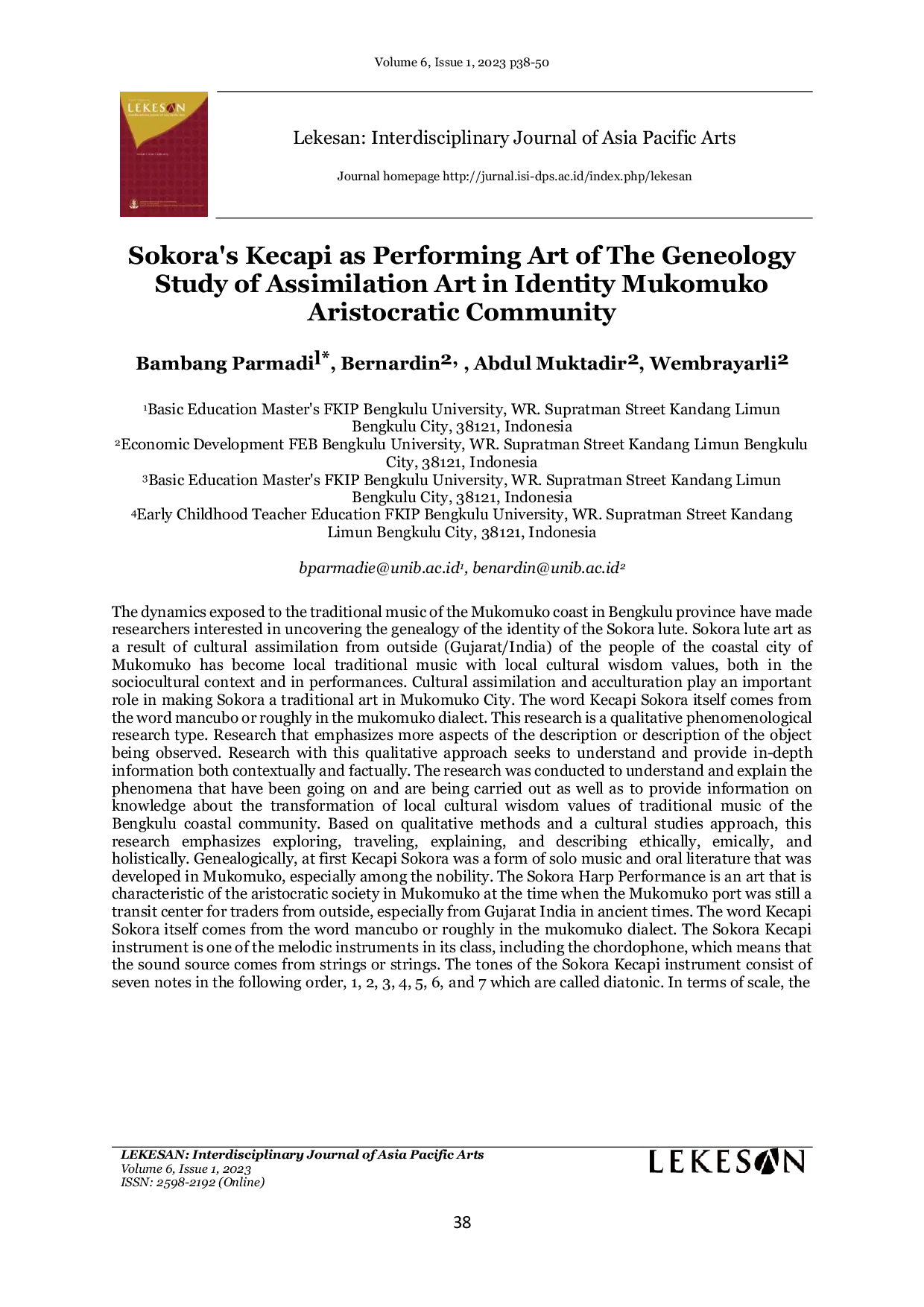 Lekesan: Interdisciplinary Journal of Asia Pacific ArtsLekesan: Interdisciplinary Journal of Asia Pacific ArtsThe dynamics exposed to the traditional music of the Mukomuko coast in Bengkulu province have made researchers interested in uncovering the genealogy of the identity of the Sokora lute. Sokora lute art as a result of cultural assimilation from outside (Gujarat/India) of the people of the coastal city of Mukomuko has become local traditional music with local cultural wisdom values, both in the sociocultural context and in performances. This research is a qualitative phenomenological research type that emphasizes describing the object being observed to understand and provide in-depth information contextually and factually. Based on qualitative methods and a cultural studies approach, this research explores, explains, and describes ethically, emically, and holistically the transformation of local cultural wisdom values of traditional music of the Bengkulu coastal community.