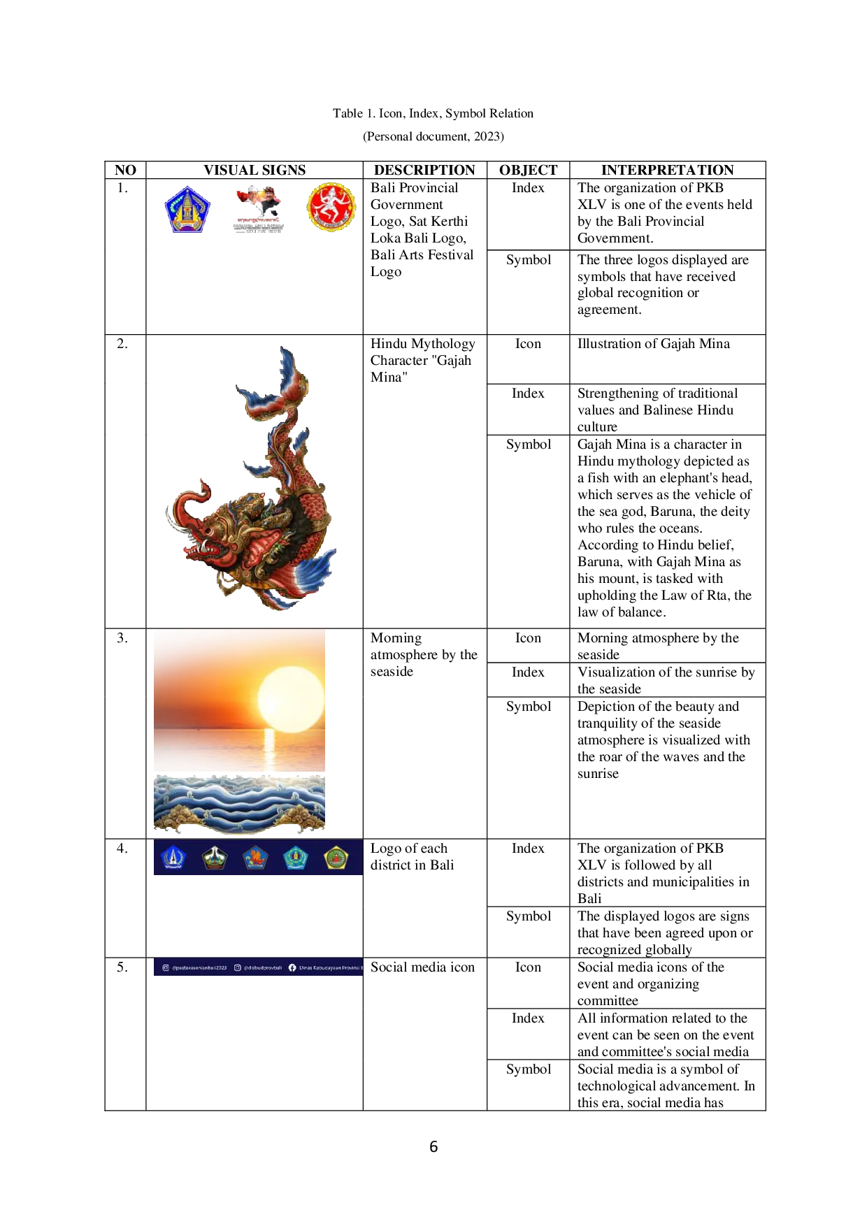 Analisis tanda-tanda visual pada billboard Bali Arts Festival XLV Tahun 2023 bertujuan untuk memahami bagaimana tanda-tanda visual tersebut menyampaikan pesan yang dapat diinterpretasikan melalui kehadirannya.Hasil analisis menunjukkan bahwa tanda-tanda visual yang digunakan dalam desain billboard Bali Arts Festival XLV Tahun 2023 adalah representasi dari tema Segara Kerthi. Segara Kerthi adalah upaya untuk memulihkan laut sebagai sumber kesejahteraan universal, yang merupakan asal mula kelahiran peradaban.Penggunaan gaya visual dari wayang Bali adalah upaya untuk memperkuat nilai-nilai tradisi dan budaya lokal di Bali.Dalam proses analisis visual, ditemukan tanda-tanda menarik seperti ilustrasi Gajah Mina sebagai perwakilan penjaga kesucian laut, ilustrasi matahari terbit di tepi laut yang menggambarkan harapan dan awal baru di mana laut dianggap sebagai sumber kehidupan.Tanda-tanda seperti logo departemen terkait dan ikon media sosial acara dan panitia juga ditemukan.Hubungan yang dihasilkan dari pengaturan tanda-tanda visual ini menyampaikan makna bahwa laut adalah sumber kehidupan yang memulai kelahiran peradaban, yang harus dilestarikan, dilindungi, dan dihormati.Tanda-tanda visual pada billboard Bali Arts Festival XLV Tahun 2023 memainkan peran penting dalam menciptakan identitas budaya yang kuat, mendidik, dan menarik penonton.Penelitian ini menarik dan perlu dikembangkan lebih lanjut dengan menggunakan berbagai pendekatan teoritis dan interdisipliner.Hal ini karena salah satu kelemahan utama semiotika adalah sifatnya yang subjektif dalam menafsirkan tanda-tanda.Karena tergantung pada persepsi individu, analisis semiotika rentan terhadap interpretasi yang beragam dan dapat dipengaruhi oleh perspektif peneliti, latar belakang budaya, dan pengalaman pribadi.Hal ini dapat menyebabkan hasil yang inkonsisten dan subjektif dalam memahami makna tanda-tanda visual pada billboard Bali Arts Festival XLV Tahun 2023.Namun, untuk mengatasi kelemahan ini, penelitian ini dapat dikembangkan dengan menerapkan teori analisis visual lainnya, seperti teori analisis wacana.Dengan pendekatan yang beragam, peneliti dapat lebih jauh mengeksplorasi konteks sosial, politik, dan budaya di mana billboard diproduksi dan disebarkan.Selain itu, dengan memilih sampel penelitian atau objek yang serupa, seperti billboard promosi untuk acara seni dan budaya lainnya di Bali atau tempat lain, penelitian ini dapat memperluas cakupan analisis dan membandingkan penggunaan tanda-tanda visual dan dampaknya dalam konteks yang berbeda.Upaya ini diharapkan dapat memberikan pemahaman yang mendalam dan kontribusi positif bagi peneliti dalam menganalisis karya komunikasi visual.
