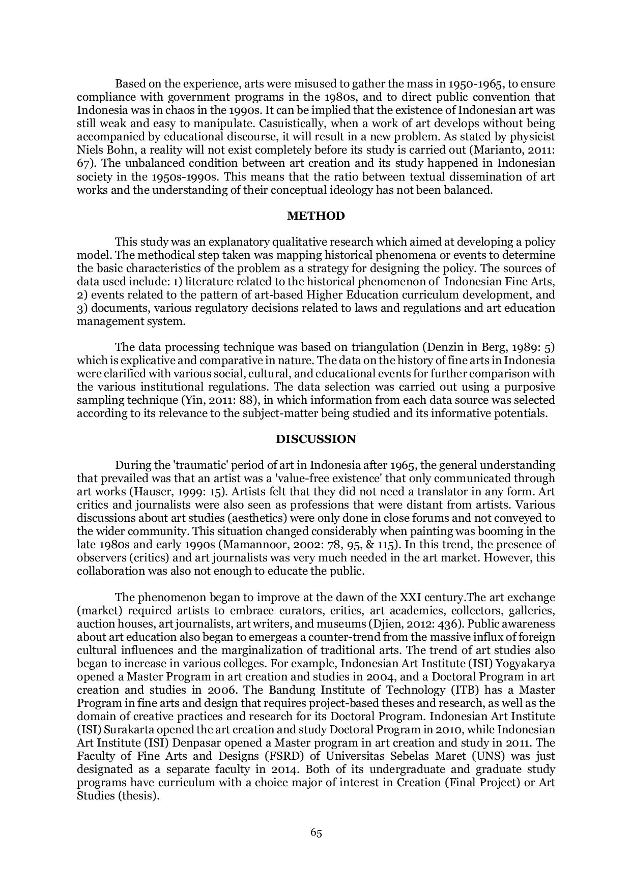 Lekesan: Interdisciplinary Journal of Asia Pacific ArtsLekesan: Interdisciplinary Journal of Asia Pacific ArtsKarya seni rupa Indonesia secara historis menunjukkan bahwa seni pernah digunakan sebagai medium provokatif untuk kepentingan politik. Kondisi ini terjadi ketika seni hanya diposisikan dalam ranah estetika faktual tanpa diimbangi dengan kecerdasan konseptual. Pada awal abad ke-21, terjadi kebangkitan wacana seni. Institusi pendidikan seni mulai mengkaji seni secara seimbang. Penelitian kualitatif berorientasi kebijakan ini menghasilkan peta historiografis posisi seni Indonesia, yang diklarifikasi oleh kebangkitan kecerdasan nasional yang ditandai oleh keterbukaan visioner dalam lingkungan pendidikan tinggi. Fenomena tersebut menuntut adaptasi dan percepatan dari level teknis ke level strategis. Akselerasi teknologi pendidikan menghilangkan berbagai model pemantauan dan evaluasi positivistik. Penggunaan Analisis SWOT dalam bidang seni perlu ditinjau kembali. Model analisis SDCS (Superioritas, Diferensiasi, Keterhubungan, dan Keberlanjutan) menawarkan analisis yang lebih visioner dalam membangun kesadaran bahwa seluruh perguruan tinggi di Indonesia seharusnya menjadi satu mekanisme pendidikan raksasa di bawah satu visi peningkatan intelektual nasional.