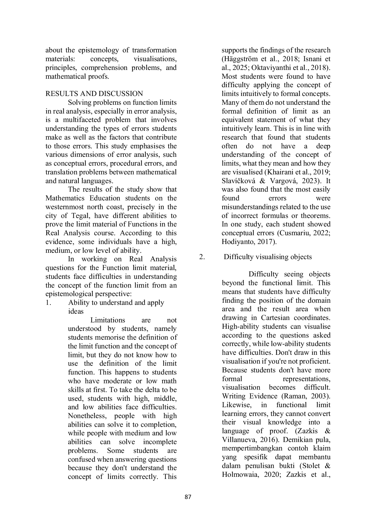 The study revealed varying levels of students ability to prove mathematical concepts, specifically in the context of function limits within a Real Analysis course.understanding and applying concepts, visualizing objects, determining principles, understanding problems, and inability to prove mathematically.These findings highlight the need for targeted interventions to address these challenges and enhance students mathematical proof skills.