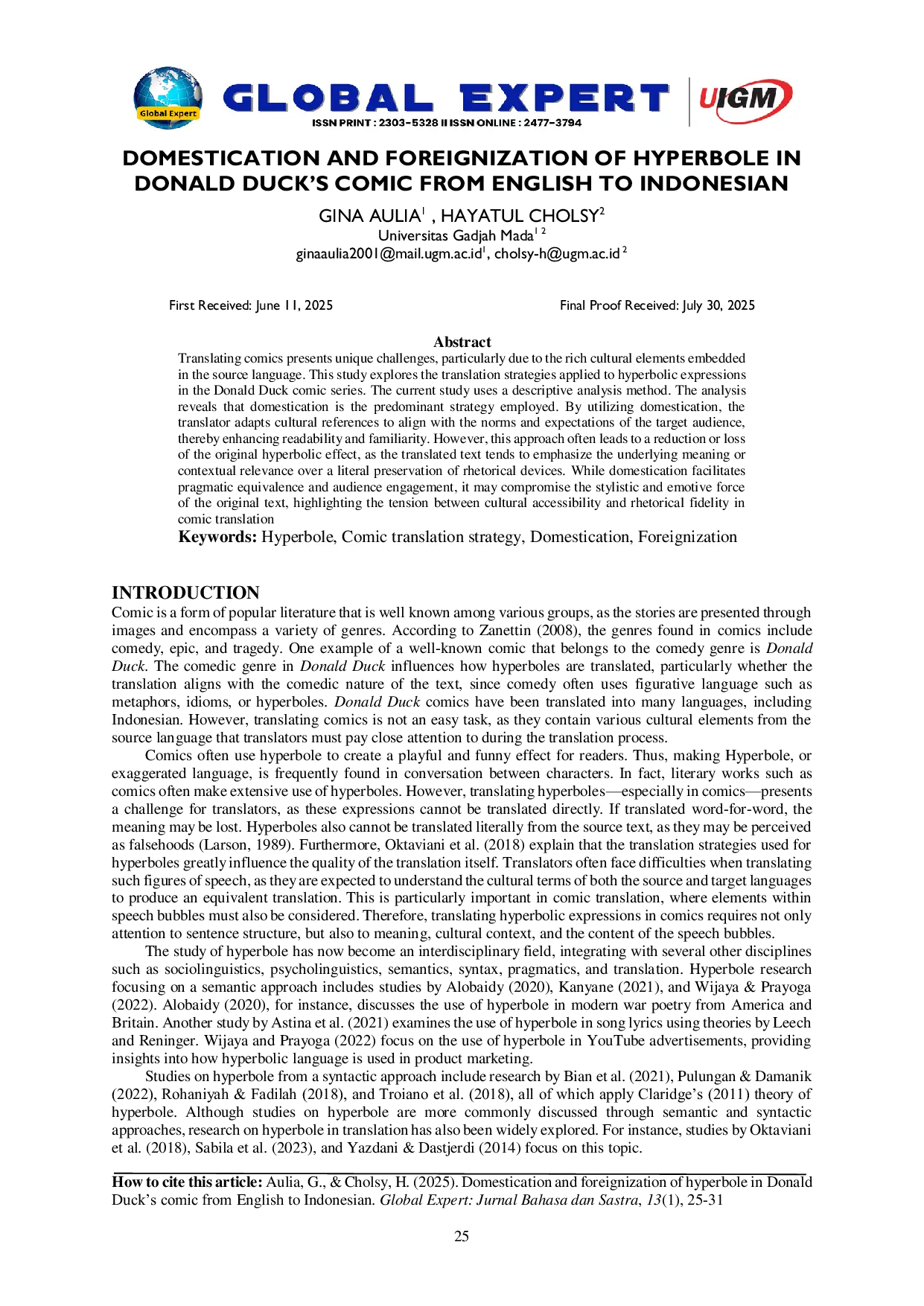 Global Expert: Jurnal Bahasa dan SastraGlobal Expert: Jurnal Bahasa dan SastraTerjemahan komik menimbulkan tantangan unik, terutama karena unsur-unsur budaya yang kaya yang tertanam dalam bahasa sumber. Penelitian ini mengeksplorasi strategi terjemahan yang diterapkan pada ungkapan hiperbola dalam serial komik Donald Duck. Penelitian saat ini menggunakan metode analisis deskriptif. Analisis mengungkapkan bahwa domestikasi adalah strategi utama yang digunakan. Dengan menggunakan domestikasi, penerjemah menyesuaikan referensi budaya agar selaras dengan norma dan ekspektasi audiens target, sehingga meningkatkan keterbacaan dan kesamaan. Namun, pendekatan ini sering kali menyebabkan pengurangan atau hilangnya efek hiperbola asli, karena teks yang diterjemahkan cenderung menekankan makna mendasar atau relevansi kontekstual daripada pelestarian harfiah perangkat retorika. Meskipun domestikasi memfasilitasi kesetaraan pragmatis dan keterlibatan audiens, hal ini dapat mengorbankan kekuatan gaya dan emosional teks asli, yang menonjolkan ketegangan antara aksesibilitas budaya dan kesetiaan retorika dalam terjemahan komik.
