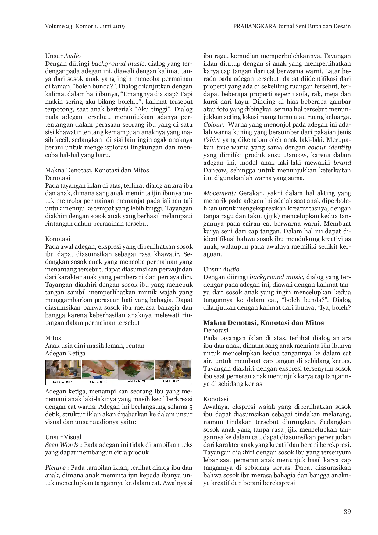 Prabangkara : Jurnal Seni Rupa dan DesainPrabangkara : Jurnal Seni Rupa dan DesainIklan televisi masuk dalam kategori media above the line, karena informasi yang disebarkan bersifat serempak dan luas. Setiap iklan di media televisi memiliki konsep yang berbeda untuk memenangkan pangsa pasar. Salah satu iklan televisi yang menarik perhatian adalah iklan produk susu formula, dimana antara produsen susu formula, ada dua brand yang terkenal dan merupakan perusahaan besar di Indonesia, yakni SGM dan Dancow. Kedua brand tersebut selalu menayangkan iklan yang unik dengan konsep yang berbeda, yang tentu saja memiliki makna yang berbeda pula. Kedua iklan tersebut, memiliki struktur yang di dalamnya terdiri dari unsur visual dan audio, unsur-unsur tersebut saling mengikat, menciptakan makna tertentu. Fokus kajian dalam penelitian ini yakni mendeskripsikan secara analitis struktur serta makna yang terkandung dalam iklan susu formula SGM dan Dancow. Penelitian ini menerapkan metode kualitatif interpretatif, dengan melibatkan pendekatan periklanan dan semiotika Roland Barthes. Manfaat dari penelitian untuk membuka wawasan dalam memahami struktur dan makna iklan di media televisi. Hasil penelitian ini menemukan bahwa penerapan unsur visual dan unsur audio pada kedua iklan memiliki beberapa persamaan dan perbedaan yang signifikan. Unsur-unsur tersebut sangat bergantung pada pertimbangan logika realitas maupun kebutuhan naratif (cerita). Sedangkan makna yang ada dibalik kedua iklan memiliki perbedaan, iklan televisi SGM lebih menonjolkan tentang karakter ideal anak usia dini, sedangkan iklan televisi Dancow lebih menawakan persepsi baru, mencoba membantah mitos seputar anak yang beredar di tengah masyarakat.