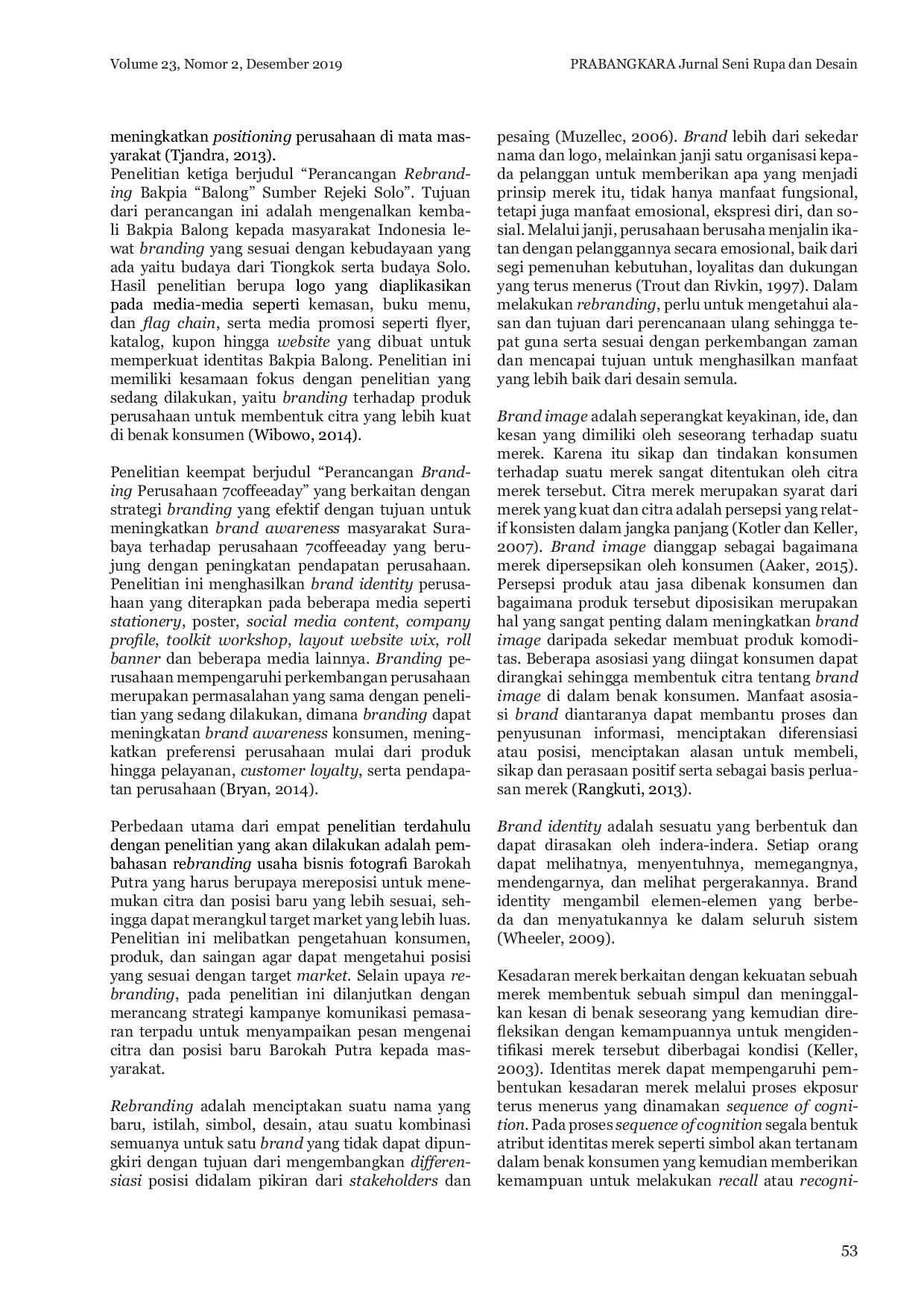 Prabangkara : Jurnal Seni Rupa dan DesainPrabangkara : Jurnal Seni Rupa dan DesainBarokah Putra adalah sebuah bisnis fotografi yang berlokasi di Karangjati, Semarang. Bisnis fotografi mengalami perkembangan pesat, sehingga menimbulkan persaingan bisnis yang ketat. Perilaku konsumen yang berubah menyebabkan penurunan jumlah konsumen yang menggunakan jasa Barokah Putra. Citra Barokah Putra sebagai penyedia layanan fotografi yang baik hanya diketahui oleh konsumen lama, sedangkan kalangan muda sebagai calon konsumen baru menganggap Barokah Putra kurang modern. Untuk mengatasi masalah ini, dilakukan upaya rebranding dengan mengembangkan differensiasi menjadi studio foto dengan layanan fun photography yang fleksibel memenuhi kebutuhan konsumen. Rebranding ini bertujuan untuk meraih target konsumen potensial berusia 20-25 tahun di wilayah Ungaran yang memiliki kesukaan berfoto untuk mengekspresikan diri. Kegiatan penyampaian pesan kepada target audiens mengenai citra dan posisi baru Barokah Putra dilakukan dengan merancang strategi komunikasi pemasaran terpadu.