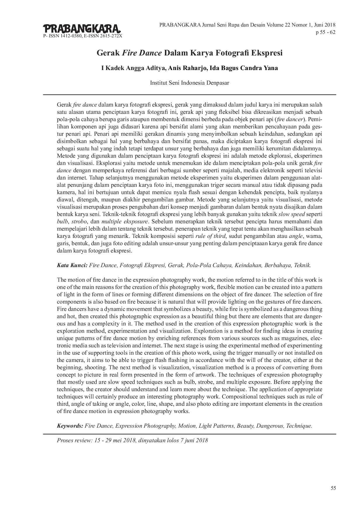 Prabangkara : Jurnal Seni Rupa dan DesainPrabangkara : Jurnal Seni Rupa dan Desain, gerak yang dimaksud dalam judul karya ini merupakan salah satu alasan utama penciptaan karya fotografi ini, gerak api yang fleksibel bisa dikreasikan menjadi sebuah pola-pola cahaya berupa garis ataupun membentuk dimensi berbeda pada objek penari api (fire dancer). Pemilihan komponen api juga didasari karena api bersifat alami yang akan memberikan pencahayaan pada gestur penari api. Penari api memiliki gerakan dinamis yang menyimbolkan sebuah keindahan, sedangkan api disimbolkan sebagai hal yang berbahaya dan bersifat panas, maka diciptakan karya fotografi ekspresi ini sebagai suatu hal yang indah tetapi terdapat unsur yang berbahaya dan juga memiliki kerumitan didalamnya.
