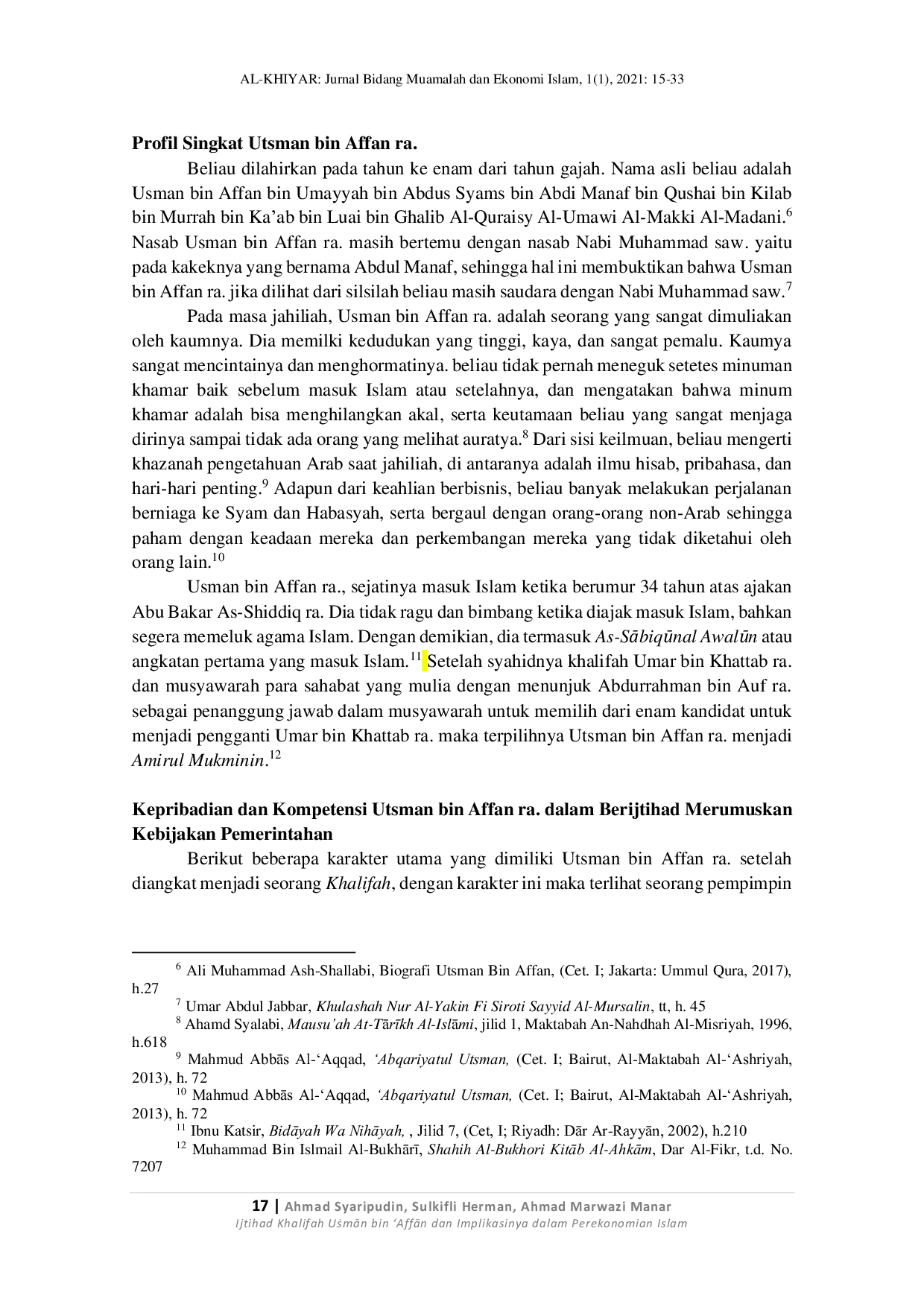 KHIYARKHIYARPenelitian ini bertujuan untuk menelaah biografi kehidupan sahabat Uṡmān bin Affān ra., metode dan hasil ijtihad para sahabat dan khalifah di masa kekhalifahan Uṡmān bin Affān ra. dalam perekonomian Islam. Metode penelitian menggunakan kajian kepustakaan (library research) berorientasi kualitatif dalam pengumpulan data dengan pendekatan historis dan normatif. Hasil penelitian menunjukkan bahwa: pertama, dari biografi Uṡmān bin Affān ditemukan bahwa beliau memiliki karakter pemimpin rabbani dari segi ilmu, kemampuan mengarahkan, dan memberikan pendidikan, kemurahan hati, toleransi, lembut, pemaaf, tawaduk, rasa malu yang tinggi, menjaga diri, murah hati, berani, teguh pendirian, sabar, adil, ibadah, warak, mudah menangis, gemar evaluasi diri, zuhud, pandai bersyukur, mencari solusi kehidupan rakyat, mencari keunikan dan mengambil manfaat dari para spesialis masyarakatnya. Kedua, ijtihad Uṡmān bin Affān ra. dalam perekomonian Islam tegak atas dasar-dasar umum ihwal pengarahannya tentang kaedah zakat, tidak melalaikan perhatian pajak kepada rakyat, mengambil apa yang apa yamg menjadi kewajiban kaum muslimin untuk Baitulmal, mengambil apa yang menjadi kewajiban ahli żimmah untuk Baitulmal dengan benar, mendidik pegawai pajak dengan sifat amanah, dan menepati janji serta menghapus penyimpangan-penyimpangan keuangan yang ditimbul di masyarakat. Ketiga, hasil ijtihad berdampak pada distribusi keuangan pada masa Uṡmān bin Affān ra. dimanfaatkan untuk membayar gaji gubernur dan tentara, membangun armada maritim, membangun dan memperluas masjid al-Haram dan masjid Nabawi, membuat sumber-sumber mata air untuk diminum, subsidi materil kepada muazin.