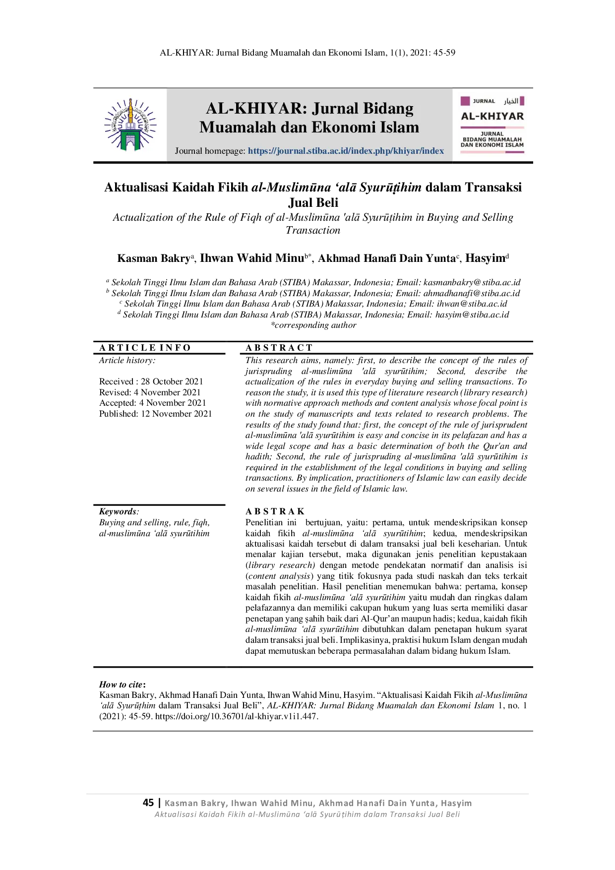 KHIYARKHIYARPenelitian ini bertujuan, yaitu: pertama, untuk mendeskripsikan konsep kaidah fikih al-muslimūna alā syurūtihim; kedua, mendeskripsikan aktualisasi kaidah tersebut di dalam transaksi jual beli keseharian. Untuk menalar kajian tersebut, maka digunakan jenis penelitian kepustakaan (library research) dengan metode pendekatan normatif dan analisis isi (content analysis) yang titik fokusnya pada studi naskah dan teks terkait masalah penelitian. Hasil penelitian menemukan bahwa: pertama, konsep kaidah fikih al-muslimūna alā syurūtihim yaitu mudah dan ringkas dalam pelafazannya dan memiliki cakupan hukum yang luas serta memiliki dasar penetapan yang ṣahih baik dari Al-Quran maupun hadis; kedua, kaidah fikih al-muslimūna alā syurūtihim dibutuhkan dalam penetapan hukum syarat dalam transaksi jual beli. Implikasinya, praktisi hukum Islam dengan mudah dapat memutuskan beberapa permasalahan dalam bidang hukum Islam.