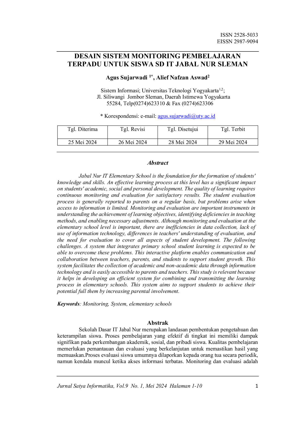 JURNAL SATYA INFORMATIKAJURNAL SATYA INFORMATIKASekolah Dasar IT Jabal Nur merupakan landasan pembentukan pengetahuan dan keterampilan siswa. Proses pembelajaran yang efektif di tingkat ini memiliki dampak signifikan pada perkembangan akademik, sosial, dan pribadi siswa. Kualitas pembelajaran memerlukan pemantauan dan evaluasi yang berkelanjutan untuk memastikan hasil yang memuaskan. Proses evaluasi siswa umumnya dilaporkan kepada orang tua secara periodik, namun kendala muncul ketika akses informasi terbatas. Monitoring dan evaluasi adalah instrumen penting dalam memahami pencapaian tujuan pembelajaran, mengidentifikasi kekurangan metode pengajaran, dan memungkinkan penyesuaian yang diperlukan meskipun pemantauan dan evaluasi di tingkat sekolah dasar penting, terdapat ketidakefisienan dalam pengumpulan data, kurangnya penggunaan teknologi informasi, perbedaan pemahaman guru tentang evaluasi, dan perlunya evaluasi komprehensif terhadap seluruh aspek perkembangan siswa. Kajian ini relevan karena membantu dalam mengembangkan sistem yang efisien untuk memantau dan mengevaluasi proses pembelajaran di sekolah dasar. Sistem ini bertujuan untuk mendukung siswa mencapai potensi penuh mereka dengan meningkatkan keterlibatan orang tua.