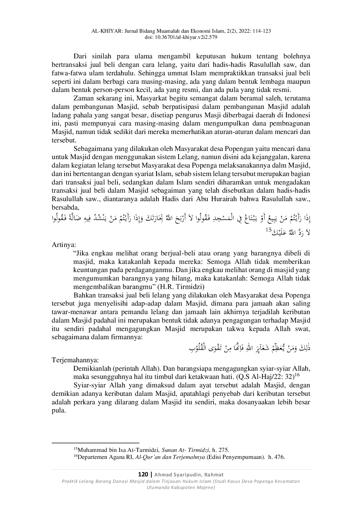 KHIYARKHIYARPenelitian ini bertujuan untuk mengetahui status hukum praktik lelang barang donasi masjid dalam tinjauan hukum Islam, di Desa Popenga Kecamatan Ulumanda Kabupaten Majene. Jenis penelitian ini adalah kualitatif dengan menggunakan analisis data induktif/kualitatif, yang memberikan gambaran situasi dan kejadian secara sistematis, utuh serta aktual, mengenai faktor-faktor dan sifat-sifat yang saling memengaruhi serta menjelaskan hubungan dari permasalahan yang sedang diteliti. Hasil penelitian menunjukkan bahwa lelang barang donasi masjid di Desa Popenga adalah memasukkan barang ke dalam Masjid dengan tujuan menyumbang atau berdonasi, kemudian dilelang agar barang tersebut berubah jadi uang, dengan demikian dana tersebut digunakan sebagai biaya pembangunan masjid. Pengadaan lelang dan transaksi seperti ini terlarang di dalam masjid karena tidak sesuai dengan syariat Islam.