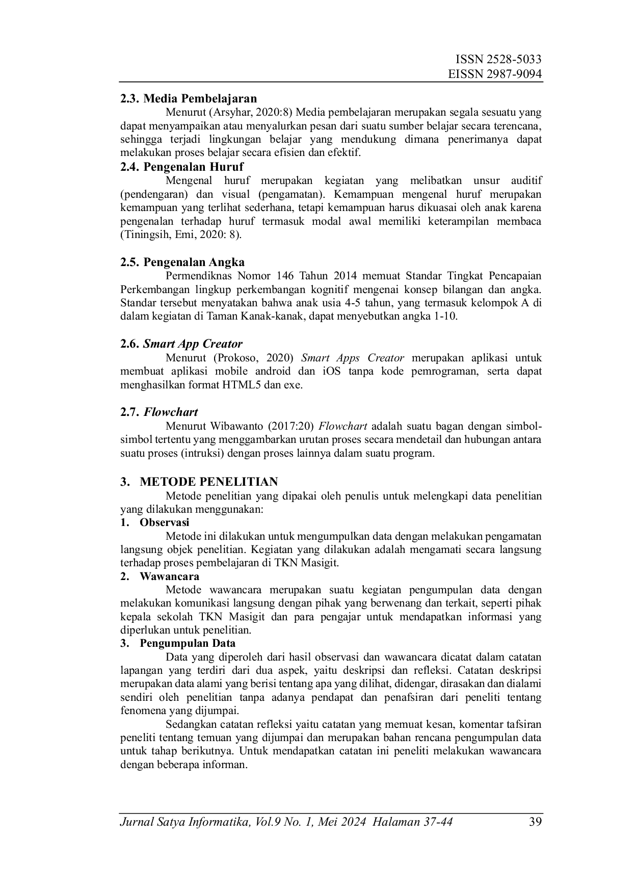 JURNAL SATYA INFORMATIKAJURNAL SATYA INFORMATIKAPendidikan harus sudah mulai diberikan kepada anak-anak sejak dini, huruf dan angka merupakan dasar untuk anak dalam belajar membaca dan menghitung. Pembelajaran pengenalan huruf dan angka wajib diajarkan kepada anak yang berusia 4 sampai dengan 6 tahun. Selama ini pembelajaran di TKN Masigit masih menggunakan buku dan papan tulis yang kurang menarik. Pada saat guru membacakan buku dan mengajarkan siswa untuk mengikuti perintah yang diberikan oleh guru tidak semua siswa dapat fokus dan kegiatan ini sangat membosankan, sehingga siswa tertinggal dalam pelajaran. Tujuan dari penelitian ini adalah menghasilkan sebuah aplikasi media pembelajaran interaktif tentang pengenalan huruf dan angka sebagai media belajar di TKN Masigit yang lebih menarik dan mudah dipelajari, metode pengumpulan data dengan cara observasi, wawancara, pengumpulan data, pengolahan data, dan hasil. Sedangkan metode pengembangan sistem menggunakan metode waterfall dan aplikasi menggunakan Smart App Creator 3. Dengan adanya aplikasi media pembelajaran interaktif pengenalan huruf dan angka dapat menarik anak-anak usia dini untuk belajar dan membuat anak-anak lebih cepat memahami huruf dan angka dikarenakan tampilan yang menarik dan mudah digunakan.