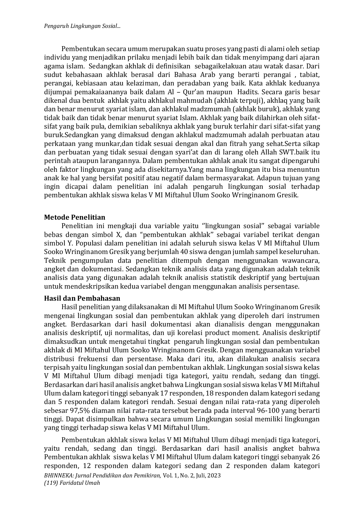 BHINNEKA: Jurnal Pendidikan dan PemikiranBHINNEKA: Jurnal Pendidikan dan PemikiranPenelitian ini bertujuan untuk mengetahui pengaruh lingkungan sosial terhadap pembentukan akhlak siswa kelas V MI Miftahul Ulum Sooko Wringinanom Gresik. Jenis penelitian ini adalah deskriptif kuantitatif dengan pendekatan korelasi. Populasi dalam penelitian ini adalah seluruh kelas V MI Miftahul Ulum yang berjumlah 40 siswa. Pengumpulan data yang digunakan berupa wawancara dokumentasi dan angket. Teknik pengumpulan data yang digunakan adalah teknik korelasi product moment. Hasil penelitian menunjukkan bahwa pengaruh lingkungan sosial terhadap pembentukan akhlak siswa dengan pencapaian nilai korelasi (r) sebesar 0,582 yang ada pada kategori kuat. Untuk uji normalitas, diperoleh data yang menunjukkan bahwa lingkungan sosial sebesar 0,403 dan pembentukan akhlak sebesar 0,312. Karena kedua variabel tersebut lebih besar dari 0,05 maka terdapat pengaruh yang signifikan antara lingkungan sosial terhadap pembentukan akhlak siswa kelas V MI Miftahul Ulum Sooko Wringinanom Gresik.