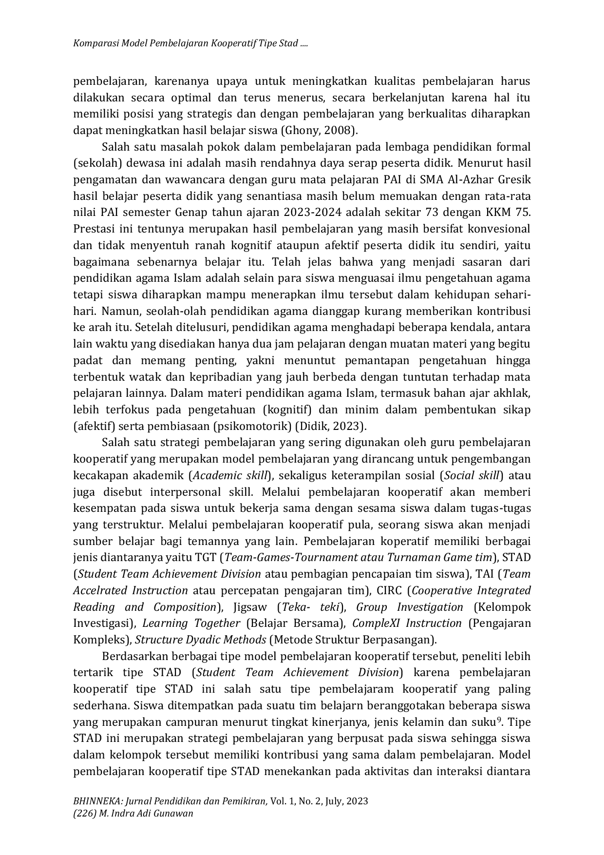 BHINNEKA: Jurnal Pendidikan dan PemikiranBHINNEKA: Jurnal Pendidikan dan PemikiranPenelitian ini bertujuan untuk mendeskripsikan penerapan model pembelajaran kooperatif tipe STAD, Tutor Sebaya dan mengetahui komparasi model pembelajaran kooperatif tipe STAD dengan metode Tutor Sebaya pada mata pelajaran PAI kelas XI di SMA Al-Azhar Menganti Gresik. Teknik pengumpulan data dalam penelitian ini adalah validasi, tes, angket, wawancara dan dokumentasi. Hasil penelitian ini menunjukkan bahwa penerapan model pembelajaran kooperatif tipe STAD di SMA Al-Azhar Menganti Gresik sesuai angket mendapat respon suka dan sangat suka. Sedangkan untuk hasil belajar siswa dikelas dengan pembelajaran kooperatif tipe STAD dikatakan tuntas secara klasikal dengan prosentase 86,2 % dan rata-rata nilai tes hasil belajarnya sebesar 87,93. Penerapan metode Tutor Sebaya di SMA Al-Azhar Menganti Gresik sesuai angket direspon minimal dalam kategori cukup. Sedangkan untuk hasil belajar siswa di kelas XI IPA 2 juga tuntas secara klasikal dengan prosentase sebesar 84,84% dan rata-rata nilai tes hasil belajarnya sebesar 83,79. Komparasi respon belajar siswa antara pembelajaran kooperatif tipe STAD dan Tutor Sebaya dilakukan menggunakan analisis uji t sehingga dapat diketahui bahwa thitung = 5,690 > ttabel = 1,671 berarti Ho ditolak dan terima Ha artinya rata-rata respon siswa kelas XI IPA 1 dengan menerapkan model Kooperatif tipe STAD lebih baik dari rata-rata respon siswa kelas XI IPA 2 setelah menerapkan model pembelajaran tutor sebaya. Sedangkan Komparasi hasil belajar siswa antara pembelajaran kooperatif tipe STAD dan tutor sebaya dilakukan menggunakan analisis uji t sehingga dapat diketahui bahwa thitung = 1,552 < ttabel = 1,671 berarti Ho diterima dan tolak Ha. Artinya rata-rata hasil belajar siswa kelas XI IPA 1 dengan menerapkan model Kooperatif tipe STAD sama dengan rata-rata hasil belajar siswa kelas XI IPA 2 setelah menerapkan model pembelajaran tutor sebaya.