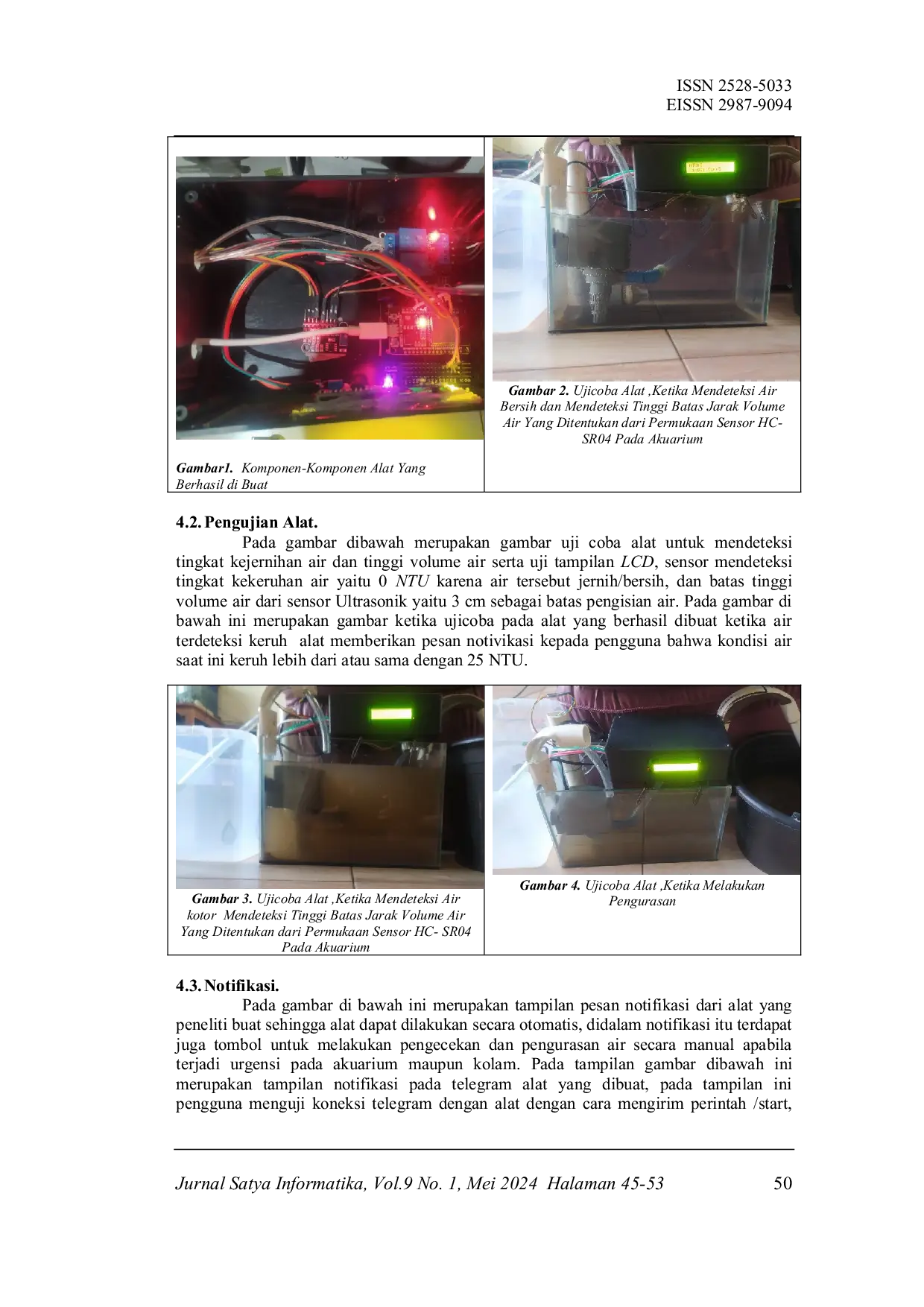 JURNAL SATYA INFORMATIKAJURNAL SATYA INFORMATIKAKualitas air merupakan faktor utama untuk pertumbuhan dan keberlangsungan hidup. Alat ini dapat diimplementasikan di akuarium maupun kolam laboratorium perikanan Universitas Satya Negara Indonesia. Namun, saat ini Laboratorium Perikanan Universitas Satya Negara Indonesia dan para pemelihara ikan lainnya masih banyak melakukan cara manual dalam mengukur kekeruhan air, yang dapat menyebabkan keterlambatan dalam pengurasan air, berpotensi menyebabkan masalah kesehatan pada ikan hingga kematian. Untuk mengatasi masalah ini, peneliti membuat alat otomatis menggunakan ESP32 dan Turbidity Sensor (TDS) untuk mendeteksi tingkat kekeruhan air, HC-SR04 digunakan untuk menentukan ketinggian batas volume air saat pengurasan dan pengisian air akuarium, dan informasi ditampilkan di layar LCD. Alat ini juga dapat mengirimkan pesan notifikasi melalui Telegram kepada pengguna untuk mencegah keterlambatan dalam mendeteksi tingkat kekeruhan air, pengurasan air, dan menjaga kesehatan ikan agar terhindar risiko kematian akibat air keruh.