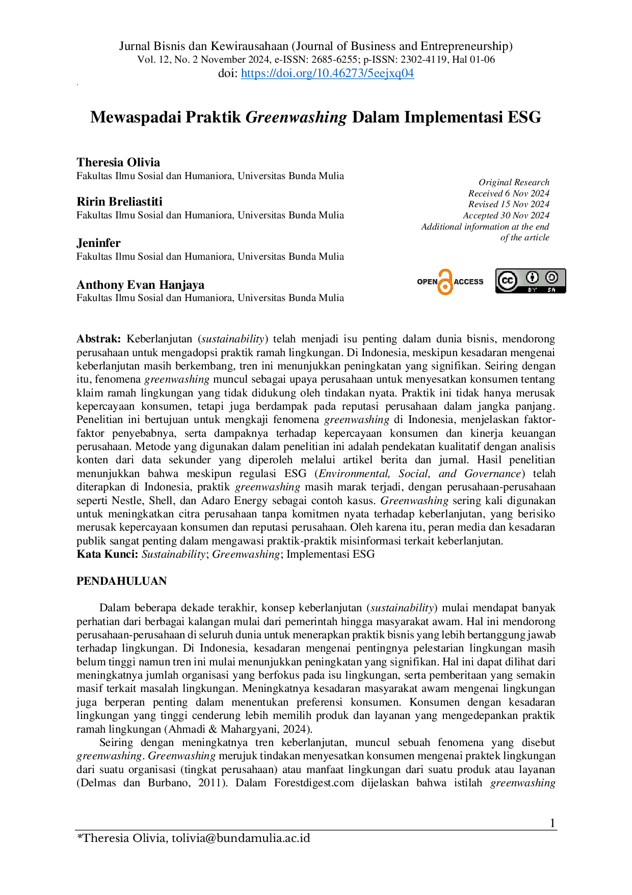 Journal of Business And EntrepreneurshipJournal of Business And EntrepreneurshipKeberlanjutan (sustainability) telah menjadi isu penting dalam dunia bisnis, mendorong perusahaan untuk mengadopsi praktik ramah lingkungan. Di Indonesia, meskipun kesadaran mengenai keberlanjutan masih berkembang, tren ini menunjukkan peningkatan yang signifikan. Seiring dengan itu, fenomena greenwashing muncul sebagai upaya perusahaan untuk menyesatkan konsumen tentang klaim ramah lingkungan yang tidak didukung oleh tindakan nyata. Praktik ini tidak hanya merusak kepercayaan konsumen, tetapi juga berdampak pada reputasi perusahaan dalam jangka panjang. Penelitian ini bertujuan untuk mengkaji fenomena greenwashing di Indonesia, menjelaskan faktor-faktor penyebabnya, serta dampaknya terhadap kepercayaan konsumen dan kinerja keuangan perusahaan. Metode yang digunakan dalam penelitian ini adalah pendekatan kualitatif dengan analisis konten dari data sekunder yang diperoleh melalui artikel berita dan jurnal. Hasil penelitian menunjukkan bahwa meskipun regulasi ESG (Environmental, Social, and Governance) telah diterapkan di Indonesia, praktik greenwashing masih marak terjadi, dengan perusahaan-perusahaan seperti Nestle, Shell, dan Adaro Energy sebagai contoh kasus. Greenwashing sering kali digunakan untuk meningkatkan citra perusahaan tanpa komitmen nyata terhadap keberlanjutan, yang berisiko merusak kepercayaan konsumen dan reputasi perusahaan. Oleh karena itu, peran media dan kesadaran publik sangat penting dalam mengawasi praktik-praktik misinformasi terkait keberlanjutan.
