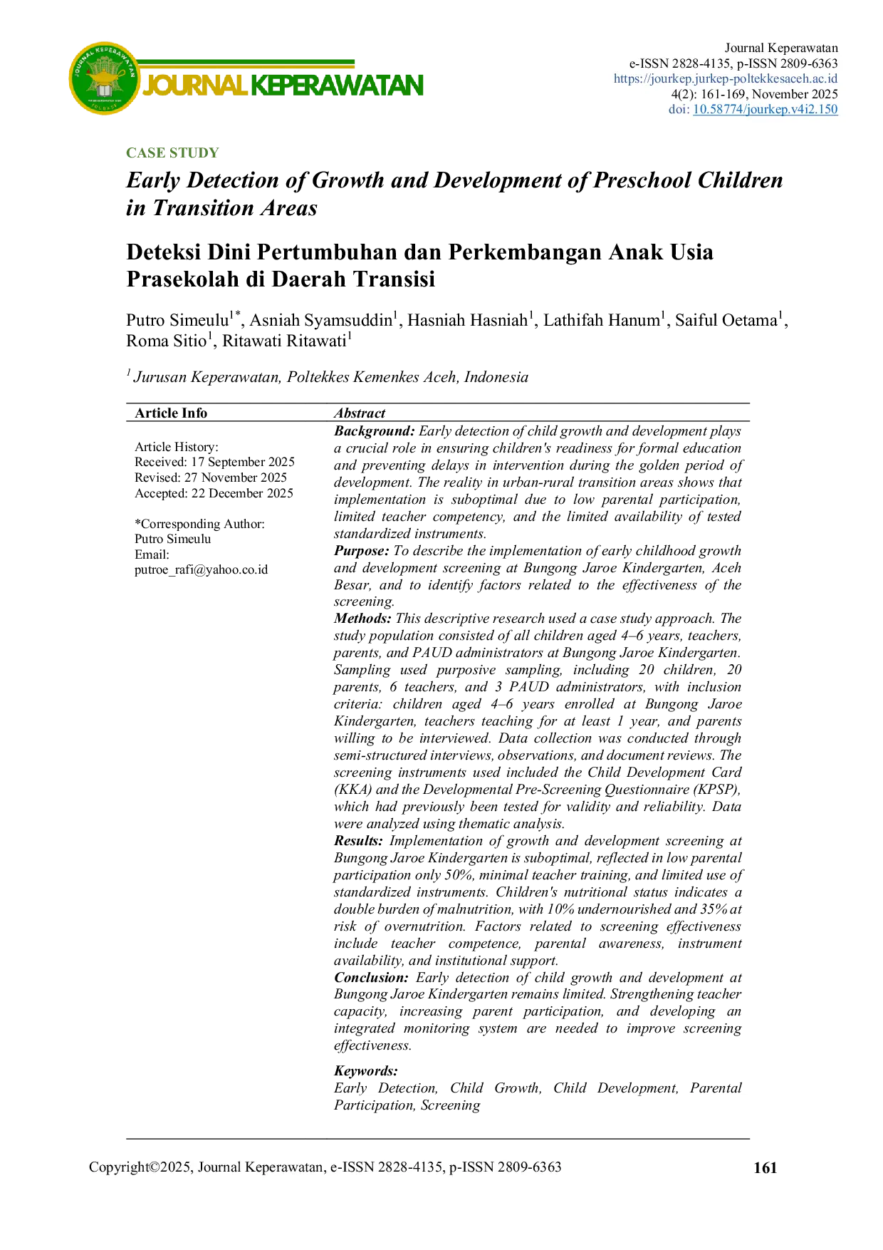 Journal KeperawatanJournal KeperawatanLatar belakang: Deteksi dini pertumbuhan dan perkembangan anak berperan krusial dalam memastikan kesiapan anak memasuki pendidikan formal serta mencegah keterlambatan pemberian intervensi pada masa emas perkembangan. Realitas di wilayah transisi perkotaan–pedesaan menunjukkan bahwa pelaksanaannya belum optimal akibat rendahnya partisipasi orang tua, keterbatasan kompetensi guru, serta minimnya ketersediaan instrumen standar yang teruji. Tujuan: Untuk mendeskripsikan pelaksanaan skrining pertumbuhan dan perkembangan anak usia dini di TK Bungong Jaroe, Aceh Besar, serta mengidentifikasi faktor-faktor yang berkaitan dengan efektivitas skrining tersebut. Metode: Penelitian deskriptif dengan menggunakan pendekatan studi kasus. Populasi penelitian yaitu seluruh anak usia 4–6 tahun, guru, orang tua, dan pengelola PAUD di TK Bungong Jaroe. Pengambilan sampel menggunakan purposive sampling, meliputi 20 anak, 20 orang tua, 6 guru, dan 3 pengelola PAUD, dengan kriteria inklusi: anak usia 4–6 tahun terdaftar di TK Bungong Jaroe, guru mengajar minimal 1 tahun, orang tua bersedia diwawancara. Pengumpulan data dilakukan melalui wawancara semi-terstruktur, observasi, dan telaah dokumen. Instrumen skrining yang digunakan meliputi Kartu Kembang Anak (KKA) dan Kuesioner Pra Skrining Perkembangan (KPSP), yang sebelumnya telah teruji validitas dan reliabilitasnya. Data dianalisis menggunakan analisis tematik. Hasil: Pelaksanaan skrining pertumbuhan dan perkembangan di TK Bungong Jaroe belum optimal, tercermin dari partisipasi orang tua yang rendah yaitu hanya 50%, minimnya pelatihan guru, serta keterbatasan penggunaan instrumen standar. Status gizi anak mengindikasikan beban gizi ganda, dengan 10% gizi kurang dan 35% berisiko gizi lebih. Faktor yang berkaitan dengan efektivitas skrining antara lain kompetensi guru, kesadaran orang tua, ketersediaan instrumen dan dukungan kelembagaan. Kesimpulan: Deteksi dini pertumbuhan dan perkembangan anak di TK Bungong Jaroe masih terbatas. Penguatan kapasitas guru, peningkatan partisipasi orang tua, dan pengembangan sistem pemantauan terintegrasi diperlukan untuk meningkatkan efektivitas skrining.