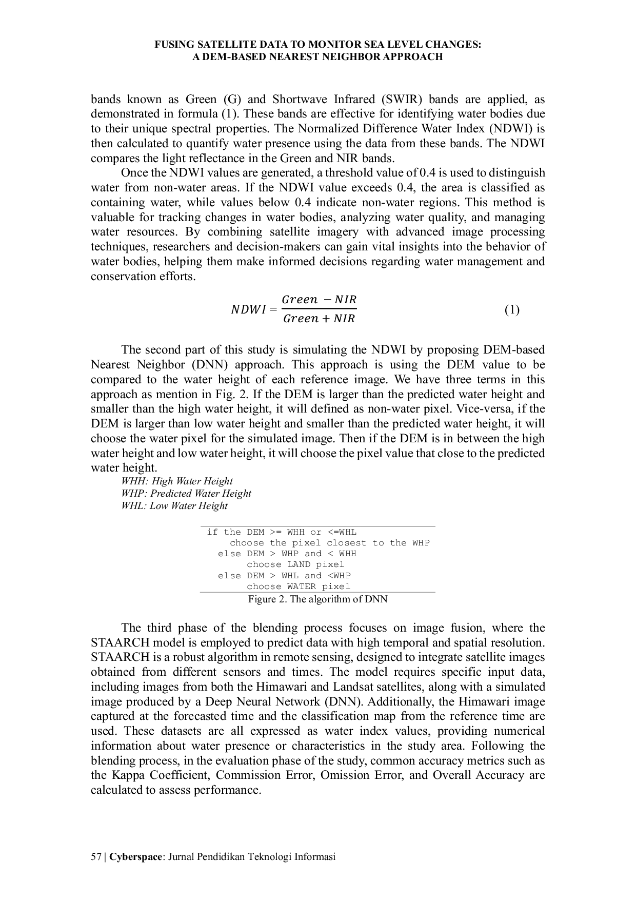 Cyberspace: Jurnal Pendidikan Teknologi InformasiCyberspace: Jurnal Pendidikan Teknologi InformasiHigh spatial and temporal resolution satellite imagery is essential for monitoring rapid environmental changes at finer scales. However, no single satellite currently provides images with both high spatial and temporal resolution. To overcome this limitation, spatiotemporal image fusion algorithms have been developed to generate images with improved spatial and temporal detail. Water level monitoring is also crucial for managing natural hazards like floods and tsunamis, but remote sensing satellites face challenges in continuous monitoring due to either low spatial or temporal resolution. This study focuses on integrating Landsat and AHI imagery to monitor local and dynamic sea level changes. The process involves calibrating images from the study area to surface reflectance and co-registering them. The Normalized Difference Water Index (NDWI) is calculated from both Landsat and Himawari-8 images, serving as input for image fusion. In the previous study, the Spatial and Temporal Adaptive Reflectance Fusion Model (STARFM) is used for image fusion. In this study we use the application of Spatial Temporal Adaptive Algorithm for Mapping Reflectance Change (STAARCH) for the image fusion step. Since traditional methods are influenced by land cover changes, this study proposes a method called DEM-based Nearest Neighbor to select appropriate land cover maps for image fusion. Evaluation results demonstrate that this approach can produce accurate water coverage maps with both high spatial and temporal resolution.