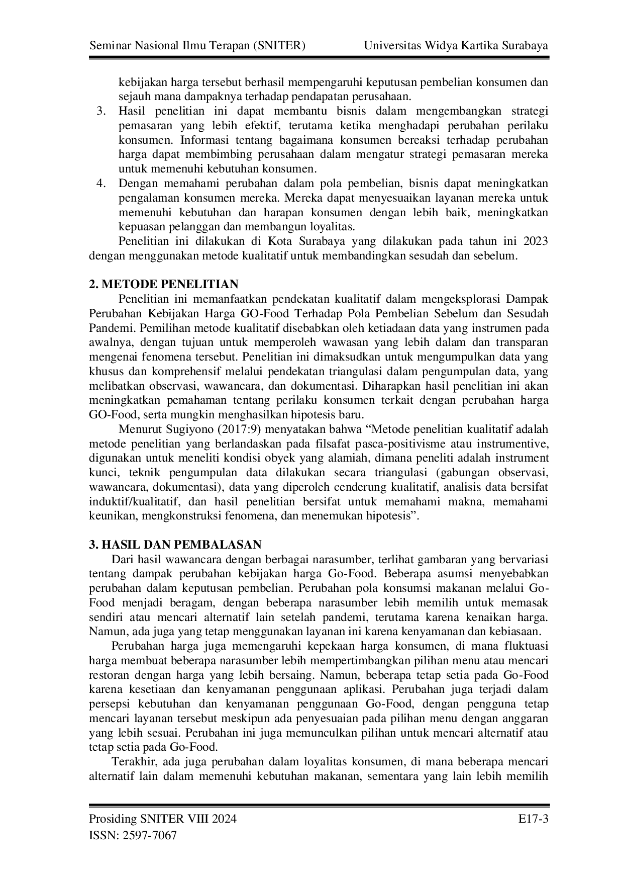 Seminar Nasional Ilmu TerapanSeminar Nasional Ilmu TerapanPenelitian ini bertujuan untuk mengeksplorasi bagaimana perubahan kebijakan harga GoFood sebelum dan sesudah pandemi memengaruhi perilaku pembelian konsumen. Penelitian ini menggunakan metode kualitatif dengan teknik wawancara mendalam terhadap 10 informan di Kota Surabaya pada tahun 2023. Melalui wawancara ini, diungkapkan bahwa perubahan kebijakan harga GoFood, terutama kenaikan harga yang terjadi setelah pandemi, berdampak signifikan pada keputusan pembelian konsumen. Konsumen yang sebelumnya cenderung menggunakan layanan GoFood secara rutin karena faktor kemudahan dan harga yang dianggap terjangkau, mulai menunjukkan perubahan perilaku. Setelah pandemi, konsumen menjadi lebih selektif dalam menggunakan platform tersebut. Mereka mulai mempertimbangkan alternatif lain, seperti memasak sendiri di rumah atau menggunakan layanan dari platform lain yang menawarkan harga lebih kompetitif. Peningkatan harga yang terasa setelah pandemi menjadi salah satu alasan utama di balik perubahan ini. Namun, di sisi lain, hasil penelitian menunjukkan bahwa banyak konsumen masih tetap setia menggunakan layanan GoFood meskipun ada kenaikan harga. Faktor kenyamanan yang ditawarkan, seperti kemudahan dalam memesan makanan, kecepatan pengantaran, serta kebiasaan yang sudah terbentuk sebelum pandemi, menjadi alasan utama konsumen tetap bertahan. Selain itu, kualitas layanan GoFood, yang meliputi variasi menu dan keandalan pengantaran, turut berkontribusi dalam mempertahankan loyalitas konsumen.