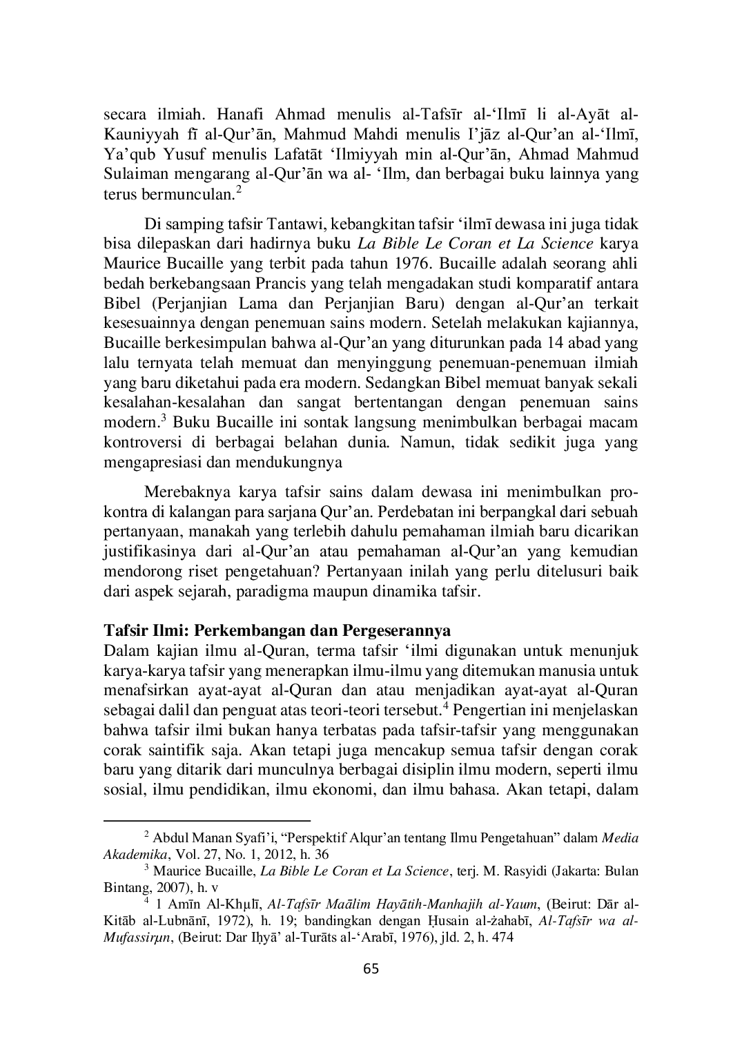 Al-Fanar : Jurnal Ilmu Al-Qur'an dan TafsirAl-Fanar : Jurnal Ilmu Al-Qur'an dan TafsirBerbicara mengenai sains dan teknologi, hadirnya tafsir dengan corak ilmi menjadi salah satu tren tafsir di abad modern dan kontemporer. Merebaknya berbagai karya tafsir dengan corak ilmi di era modern-kontemporer ini seringkali diatribusikan karena pengaruh luas dari munculnya magnum opus Tantawi Jauhari (w. 1358 H/1940 M), al-Jawāhir fī Tafsīr al-Quran al-Karīm. Berbicara mengenai dinamika geliat tafsir ilmi di Indonesia terus berkembang. Di era 1960-an, tafsir al-Nur karya Hasbi ash-Shiddieqiy sudah mulai menggunakan penemuan sains dalam menafsirkan beberapa ayat al-Quran, meskipun dengan jumlah yang masih sangat sedikit. Era 1990-an ditandai dengan merebaknya buku-buku tentang relasi al-Quran dan sains. Dan di era 2010-an sudah muncul karya tafsir ilmi yang utuh, seperti Tafsir Ilmi Air dalam Perspektif al-Quran dan Sains, Tumbuhan dalam Perspektif al-Quran dan Sains, dan Kiamat dalam Perspektif al-Quran dan Sains yang merupakan karya hasil kerjasama antara Lajnah Pentashihan Mushaf al-Quran Badan Litbang dan Diklat Kementrian Agama RI dengan Lembaga Ilmu Pengetahuan Indonesia (LIPI), dan Tafsir Salman Tafsir Ilmiah atas Juz Amma karya para ilmuan dan saintis ITB.