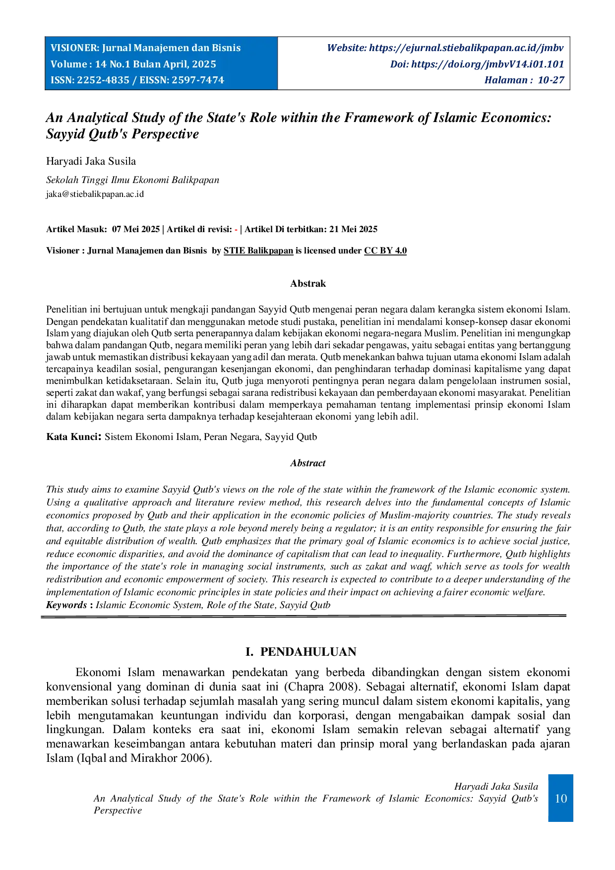 Visioner : Jurnal Manajemen dan BisnisVisioner : Jurnal Manajemen dan BisnisPenelitian ini bertujuan untuk mengkaji pandangan Sayyid Qutb mengenai peran negara dalam kerangka sistem ekonomi Islam. Dengan pendekatan kualitatif dan menggunakan metode studi pustaka, penelitian ini mendalami konsep-konsep dasar ekonomi Islam yang diajukan oleh Qutb serta penerapannya dalam kebijakan ekonomi negara-negara Muslim. Penelitian ini mengungkap bahwa dalam pandangan Qutb, negara memiliki peran yang lebih dari sekadar pengawas, yaitu sebagai entitas yang bertanggung jawab untuk memastikan distribusi kekayaan yang adil dan merata. Qutb menekankan bahwa tujuan utama ekonomi Islam adalah tercapainya keadilan sosial, pengurangan kesenjangan ekonomi, dan penghindaran terhadap dominasi kapitalisme yang dapat menimbulkan ketidaksetaraan. Selain itu, Qutb juga menyoroti pentingnya peran negara dalam pengelolaan instrumen sosial, seperti zakat dan wakaf, yang berfungsi sebagai sarana redistribusi kekayaan dan pemberdayaan ekonomi masyarakat. Penelitian ini diharapkan dapat memberikan kontribusi dalam memperkaya pemahaman tentang implementasi prinsip ekonomi Islam dalam kebijakan negara serta dampaknya terhadap kesejahteraan ekonomi yang lebih adil.