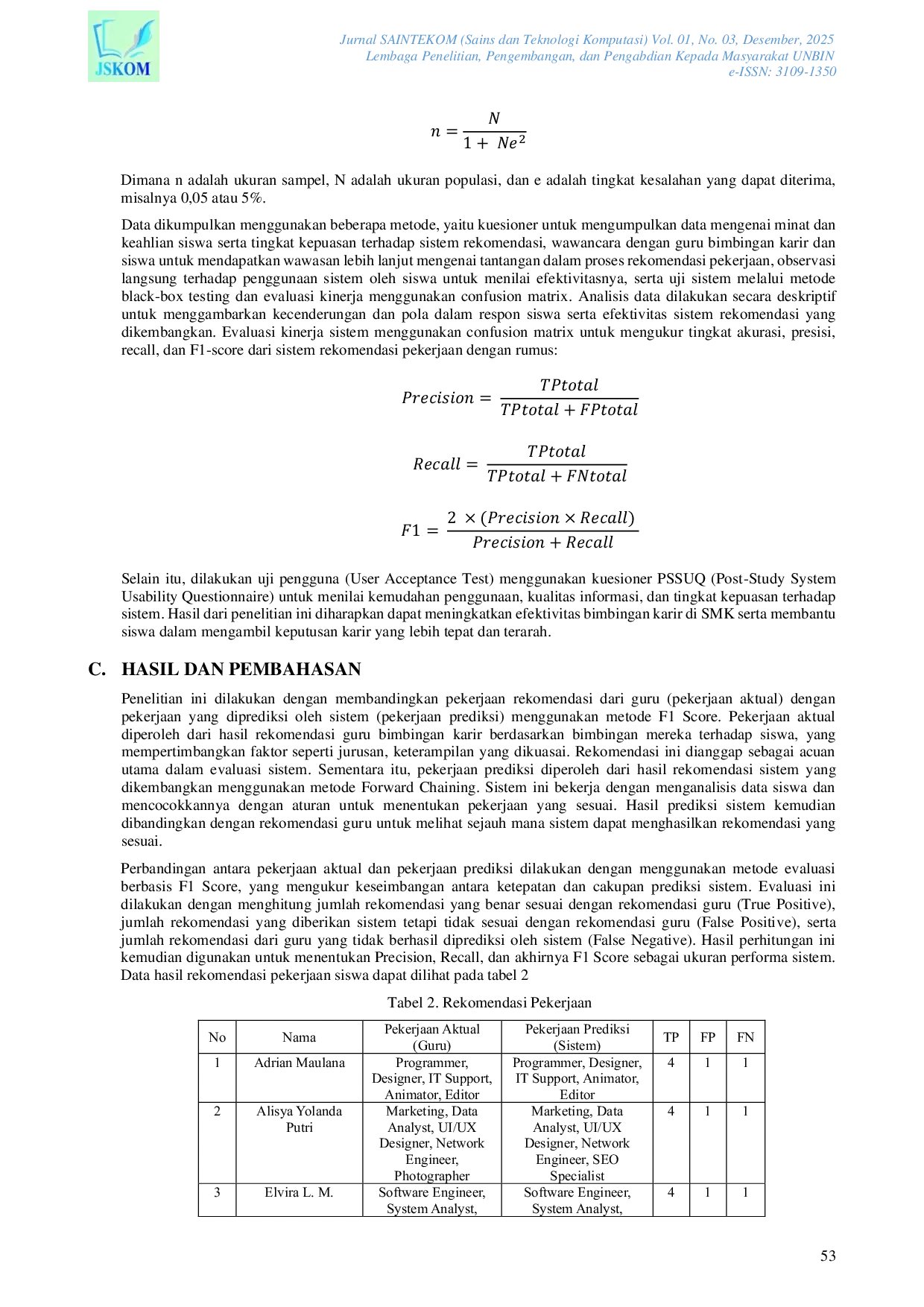 Jurnal SAINTEKOM (Sains dan Teknologi Komputasi)Jurnal SAINTEKOM (Sains dan Teknologi Komputasi)Bimbingan karir di SMK memegang peranan krusial dalam membantu siswa menemukan jalur karir yang sesuai dengan potensi, minat, dan bakat mereka. Namun, sistem bimbingan karir yang masih mengandalkan metode wawancara tradisional menghadapi berbagai kendala signifikan. Banyak siswa mengalami keterbatasan waktu konsultasi karena jumlah siswa yang harus ditangani jauh melebihi kapasitas yang ada. Hal ini mengakibatkan proses bimbingan menjadi kurang mendalam, sehingga rekomendasi pekerjaan yang diberikan tidak selalu tepat dan efektif. Selain itu, proses pemberian rekomendasi pekerjaan sering kali memakan waktu yang lama, membuat siswa harus menunggu giliran dan terkadang kehilangan momentum dalam mencari informasi yang mereka butuhkan. Kendala lainnya muncul pada aksesibilitas informasi; setelah sesi bimbingan selesai, informasi yang telah disampaikan sulit untuk diakses kembali, sehingga siswa merasa tidak mendapatkan dukungan yang optimal dalam menentukan langkah karir mereka ke depan. Metode yang digunakan adalah metode penelitian dan pengembangan (R&D) dengan pendekatan deskriptif. Hasil penelitian menunjukkan bahwa metode forward chaining untuk rekomendasi pekerjaan karir dapat meningkatkan efisiensi dalam proses pemberian rekomendasi. Berdasarkan uji kelayakan oleh ahli sistem, aplikasi ini dinyatakan “Sangat Layak dengan tingkat kelayakan 100%. Selanjutnya aplikasi ini juga telah dilakukan uji pengguna dengan menggunakan kuesioner PSSUQ yang dibagi menjadi empat kategori, di antaranya Secara Keseluruhan (Overall) sebesar 87%, Kegunaan Sistem (System Usefullness) sebesar 87,5 Kualitas Informasi (Information Quality) sebesar 89,1%, dan Kualitas Antarmuka (Interface Quality) sebesar 83,1% yang artinya aplikasi ini “Sangat Layak digunakan. Selain itu, uji hasil menggunakan confusion matrix dari metode menunjukan bahwa sistem ini memiliki tingkat accuracy mencapai 88%, precision 88%, recall 88%, dan F1-score 88%. Hasil penelitian ini menunjukkan bahwa sistem yang dibangun mampu meningkatkan efektivitas dan ketepatan yang baik dalam proses pemberian rekomendasi pekerjaan pada siswa. Implementasi sistem ini diharapkan dapat menjadi solusi inovatif dalam proses rekomendasi pekerjaan pada bimbingan karir.