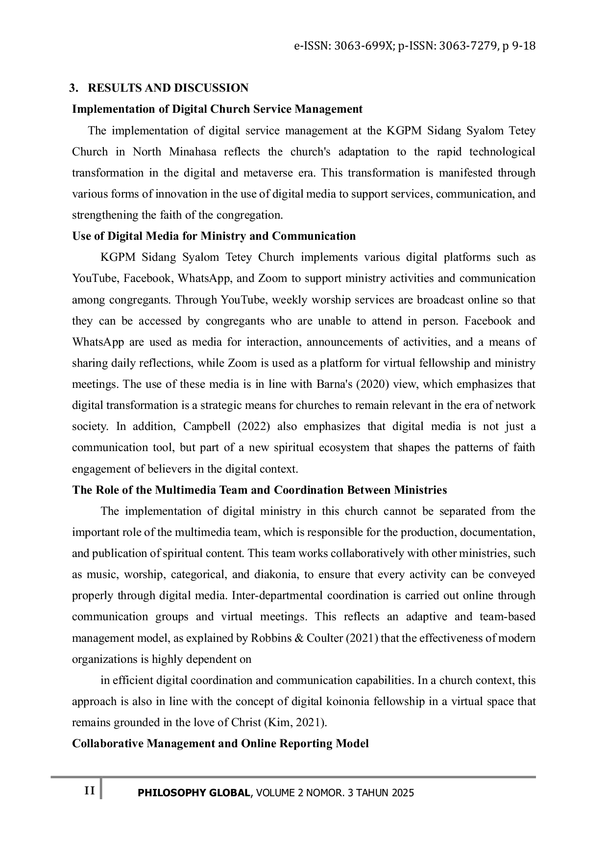 Philosophy Global: International Journal of Christian and Catholic PhilosophyPhilosophy Global: International Journal of Christian and Catholic PhilosophyPerkembangan teknologi digital telah mengubah paradigma pelayanan gereja dari model konvensional menjadi pelayanan berbasis digital dan metaverse yang lebih partisipatif. Studi ini bertujuan untuk menganalisis bagaimana nilai-nilai Kristen diintegrasikan ke dalam manajemen pelayanan digital Gereja KGPM Sidang Syalom Tetey, Minahasa Utara. Menggunakan pendekatan kualitatif dengan metode studi kasus kontekstual, penelitian ini mengeksplorasi penerapan prinsip-prinsip iman seperti kasih, tanggung jawab, kejujuran, loyalitas, dan kepemimpinan pelayan dalam pengelolaan pelayanan digital gereja. Hasil penelitian menunjukkan bahwa manajemen pelayanan digital di gereja ini berhasil menggabungkan inovasi teknologi dengan spiritualitas Kristen melalui penggunaan media digital, koordinasi tim multimedia, dan pelaporan daring yang akuntabel. Integrasi nilai-nilai Kristen memungkinkan gereja untuk melaksanakan pelayanan yang relevan secara teknologi tanpa kehilangan dimensi etika dan spiritualnya. Dalam konteks era metaverse, gereja menghadapi tantangan etika, relasional, dan spiritual, tetapi juga memperoleh peluang misi baru untuk memperluas pelayanan mereka melampaui batas geografis. Implikasi teologis dari penelitian ini menekankan pentingnya diskernaan teologis dan akuntabilitas spiritual dalam mengarahkan penggunaan teknologi sebagai sarana misi, bukan sebagai tujuan akhir. Dengan demikian, gereja dipanggil untuk menjadi agen etika dan profetik di tengah transformasi digital, menjadikan teknologi sebagai alat untuk memuliakan Kristus dan memperkuat kehidupan iman jemaat.