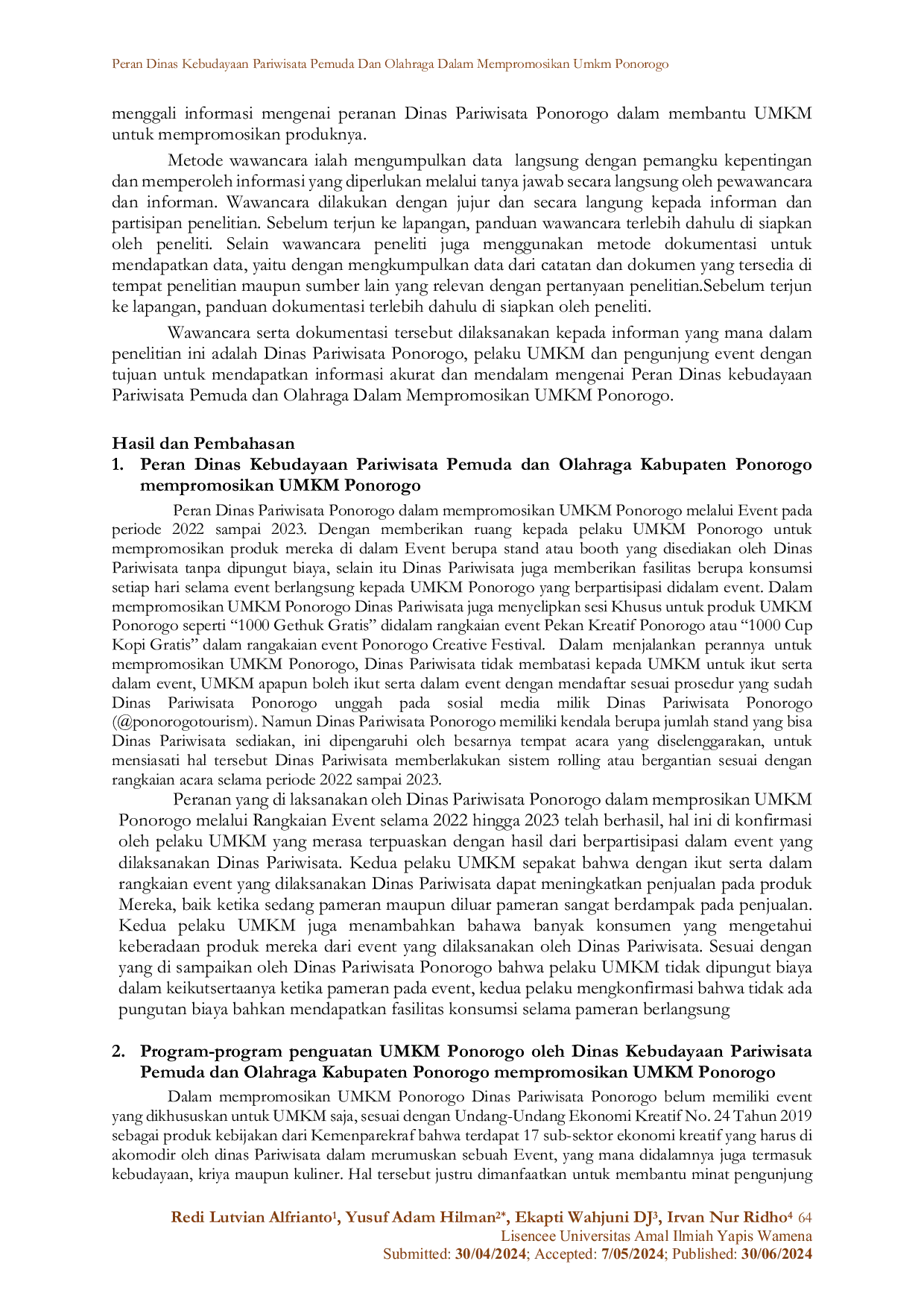 24 Tahun 2019, Dinas Kebudayaan Pariwisata Pemuda dan Olahraga Ponorogo melaksanakan serangkaian event yang mengakomodir 17 sub-sektor ekonomi kreatif serta memberikan ruang bagi UMKM untuk berpartisipasi dalam pameran.Peran dinas dalam mempromosikan UMKM dilakukan melalui event-event yang melibatkan pelaku UMKM, seperti Pekan Kreatif Ponorogo, dengan menggabungkan pertunjukan seni dan pameran produk UMKM.Hasilnya, pelaku UMKM merasakan peningkatan penjualan dan peningkatan kualitas usaha, sementara masyarakat mendapatkan hiburan sekaligus informasi mengenai produk lokal.