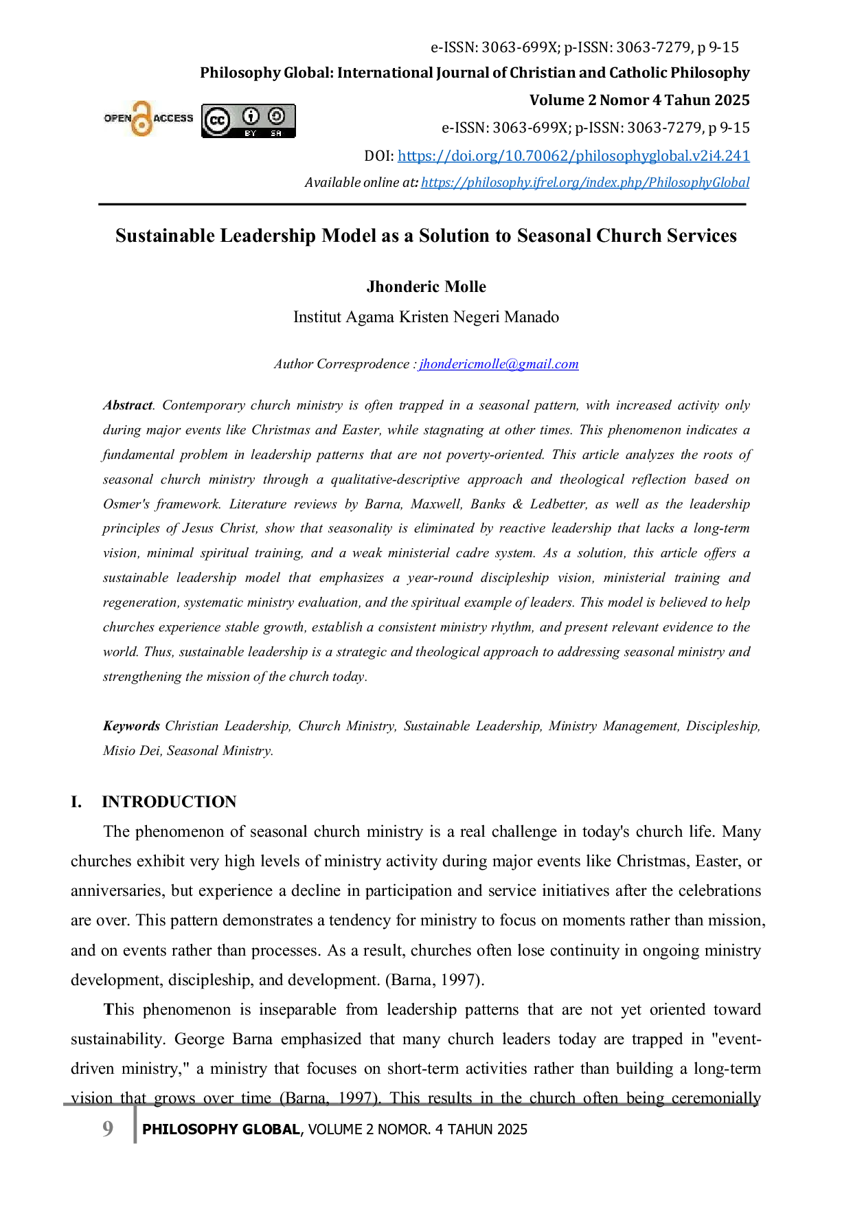 Philosophy Global: International Journal of Christian and Catholic PhilosophyPhilosophy Global: International Journal of Christian and Catholic PhilosophyKementerian gereja kontemporer sering terjebak dalam pola musiman, dengan peningkatan aktivitas hanya selama acara besar seperti Natal dan Paskah, sementara stagnan pada waktu lain. Fenomena ini menunjukkan masalah mendasar dalam pola kepemimpinan yang tidak berorientasi pada kemiskinan. Artikel ini menganalisis akar dari kementerian gereja musiman melalui pendekatan kualitatif-deskriptif dan refleksi teologis berdasarkan kerangka Osmer. Tinjauan pustaka oleh Barna, Maxwell, Banks & Ledbetter, serta prinsip kepemimpinan Yesus Kristus, menunjukkan bahwa musim gugur dihilangkan oleh kepemimpinan reaktif yang kurang memiliki visi jangka panjang, pelatihan spiritual minimal, dan sistem kerangka kementerian yang lemah. Sebagai solusi, artikel ini menawarkan model kepemimpinan berkelanjutan yang menekankan visi kedisiplinan sepanjang tahun, pelatihan dan regenerasi kementerian, evaluasi kementerian sistematis, dan contoh spiritual pemimpin. Model ini diyakini dapat membantu gereja mengalami pertumbuhan stabil, menetapkan ritme kementerian yang konsisten, dan menyajikan bukti relevan kepada dunia. Dengan demikian, kepemimpinan berkelanjutan adalah pendekatan strategis dan teologis untuk mengatasi kementerian musiman dan memperkuat misi gereja saat ini.