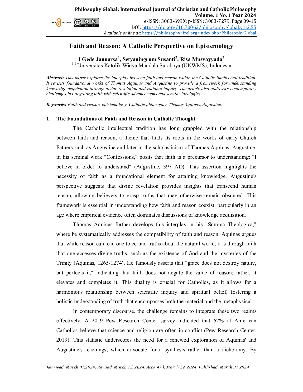 Philosophy Global: International Journal of Christian and Catholic PhilosophyPhilosophy Global: International Journal of Christian and Catholic PhilosophyArtikel ini meneliti hubungan antara iman dan rasio dalam tradisi intelektual Katolik. Penelitian menggali karya klasik Tomas Aquinas dan Augustinus untuk membangun kerangka pemahaman akuisisi pengetahuan melalui wahyu ilahi dan penyelidikan rasional. Selain itu, artikel membahas tantangan kontemporer dalam mengintegrasikan iman dengan kemajuan ilmiah dan ideologi sekuler serta menjajaki cara Katolik dapat memfasilitasi dialog harmonis antara ilmu pengetahuan dan keyakinan spiritual.