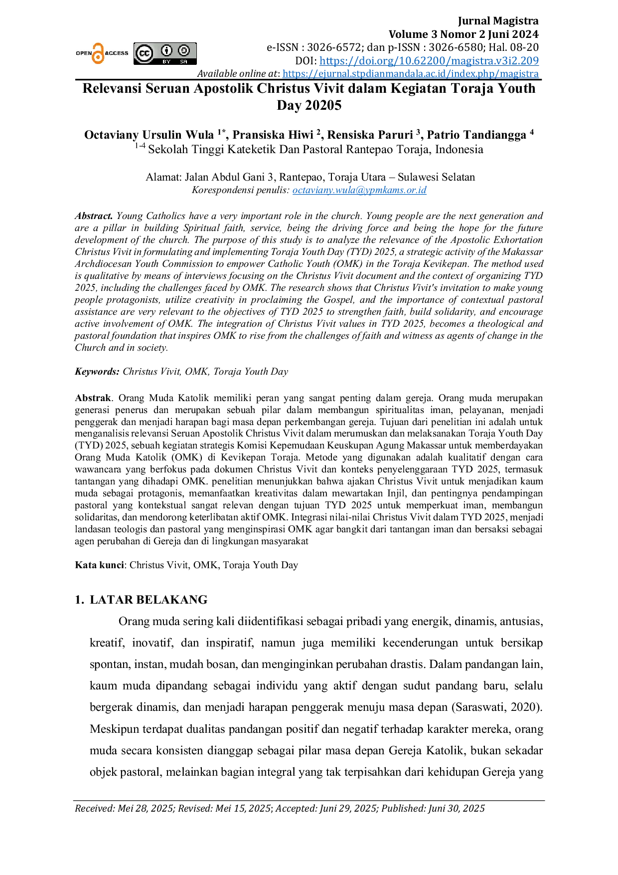 - Relevansi Seruan Apostolik Christus Vivit dalam Kegiatan Toraja Youth Day 20205 | Jurnal Magistra. relevansi... ejurnal.stpdianmandala.ac.id/index.php/magistra/article/view/209Relevansi Seruan Apostolik Christus Vivit dalam Kegiatan Toraja Youth Day 20205 Jurnal Magistra relevansi ejurnal stpdianmandala ac index php magistra article view 209