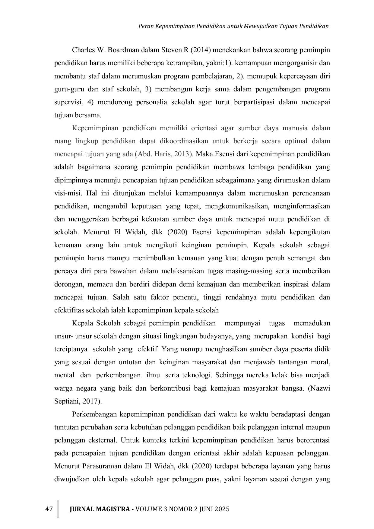 Jurnal MagistraJurnal MagistraPemimpin pada level manapun dan pada organisasi apapun sangat dibutuhkan untuk menata dan menggerakan berbagai sumber daya yang ada dalam organisasi demi pencapaian tujuan organisasi tersebut. Demikian juga dalam konteks organisasi pendidikan. Pimpinan Perguruan Tinggi serta para kepala sekolah sangat berperan penting dalam memimpin, mengorganisasir, menggerakan dan menata lembaga pendidikan yang dipimpinnya guna terciptanya pendidikan berkualitas. Penelitian ini dilakukan dengan pendekatan kepustakaan, dimana peneliti menelaah berbagai kajian teoritis dari para ahli tentang kepemimpinan secara umum, kepempinan pendidikan serta temuan para peneliti pendahulu terkait peran dan pengaruh kepempinan pendidikan terhadap pencapaian tujuan organisasi pendidikan. Dari berbagai literatur dapat disimpulkan bahwa kualitas kepemimpinan yang dimiliki oleh seorang pemimpin pendidikan secara substansial berpengaruh terhadap keberhasilan suatu lembaga pendidikan. Tipe dan gaya kepemimpinan yang mereka miliki dan terapkan juga turut menentukan efektivitas dan kecepatan suatu lembaga pendidikan dalam mencapai visi-misi sebagaimana yang digariskan oleh lembaga pendidikan tersebut.