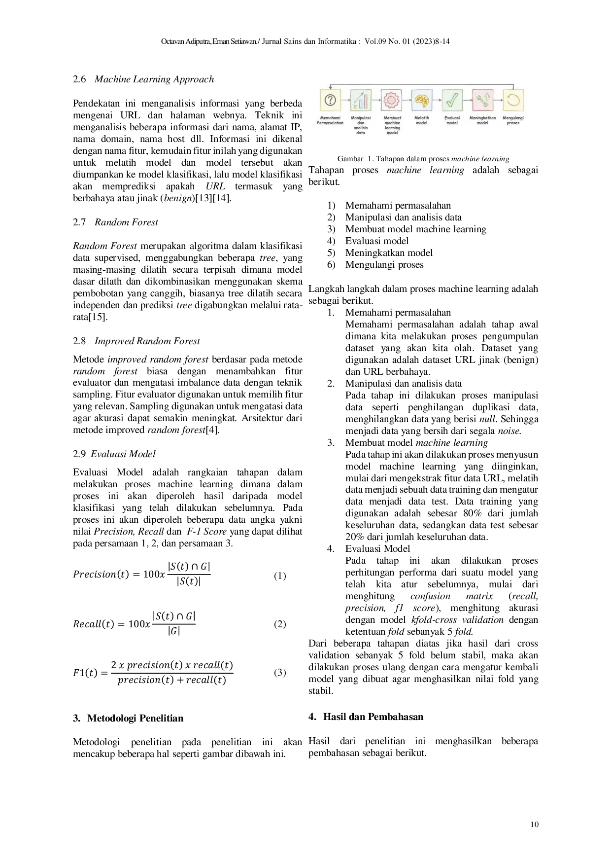SAINS DAN INFORMATIKA : RESEARCH OF SCIENCE AND INFORMATICSAINS DAN INFORMATIKA : RESEARCH OF SCIENCE AND INFORMATICURL sangat banyak berada pada jaringan sistem komputer. Apalagi saat ini semua kegiatan menggunakan sistem online. Mulai dari media sosial, marketplace hingga aplikasi chatting grup. Untuk menangkal banyaknya URL yang beredar di sistem online tersebut, maka dibutuhkan sistem pencegahan dini dari serangan URL berbahaya. Sebelumnya deteksi malicious URL berbasis Blacklisting dan URL Heuristic tidak dapat mengenali malicious URL jenis baru tanpa di analisis terlebih dahulu. Untuk itu diperlukan teknik mendeteksi malicious URL menggunakan machine learning. Kekurangan machine learning dalam pendeteksian malicious URL bahwa tidak 100% dapat mendeteksi malicious URL secara tepat. Pada penelitian ini akan digunakan pendekatan improved random forest dengan random forest sebagai classifier untuk mendeteksi malicious URL. Improved Random Forest merupakan Random Forest yang dipakai menggunakan feature evaluator dan instance filter untuk meningkatkan akurasi dari random forest biasa. Penelitian ini menghasilkan kesimpulan bahwa kedua metode baik improved random forest maupun random forest biasa memiliki nilai akurasi diatas 99%.