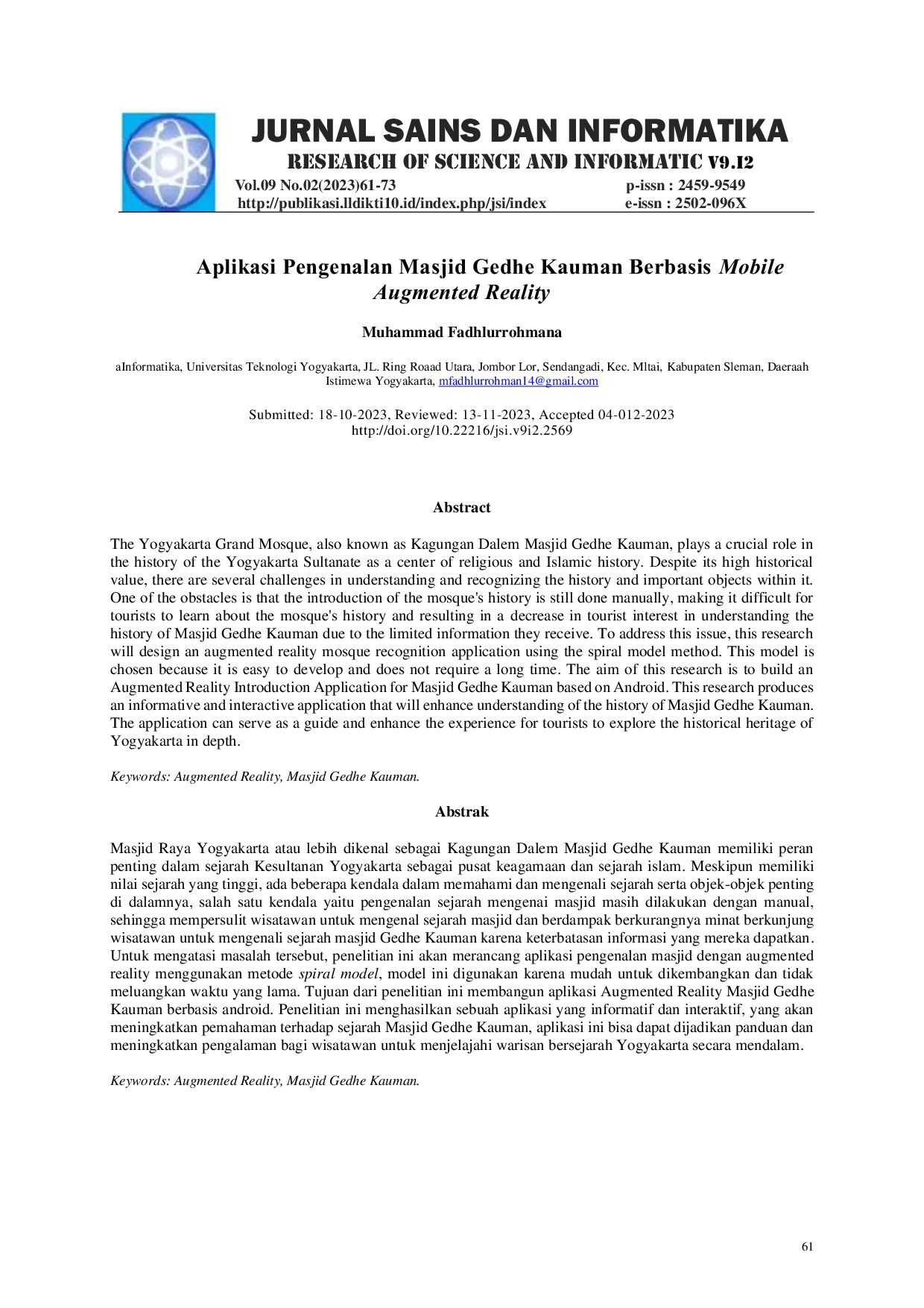 SAINS DAN INFORMATIKA : RESEARCH OF SCIENCE AND INFORMATICSAINS DAN INFORMATIKA : RESEARCH OF SCIENCE AND INFORMATICMasjid Raya Yogyakarta atau lebih dikenal sebagai Kagungan Dalem Masjid Gedhe Kauman memiliki peran penting dalam sejarah Kesultanan Yogyakarta sebagai pusat keagamaan dan sejarah Islam. Meskipun memiliki nilai sejarah yang tinggi, ada beberapa kendala dalam memahami dan mengenali sejarah serta objek-objek penting di dalamnya, salah satu kendala yaitu pengenalan sejarah mengenai masjid masih dilakukan dengan manual, sehingga mempersulit wisatawan untuk mengenal sejarah masjid dan berdampak berkurangnya minat berkunjung wisatawan untuk mengenali sejarah masjid Gedhe Kauman karena keterbatasan informasi yang mereka dapatkan. Untuk mengatasi masalah tersebut, penelitian ini akan merancang aplikasi pengenalan masjid dengan augmented reality menggunakan metode spiral model, model ini digunakan karena mudah untuk dikembangkan dan tidak meluangkan waktu yang lama. Tujuan dari penelitian ini membangun aplikasi Augmented Reality Masjid Gedhe Kauman berbasis android. Penelitian ini menghasilkan sebuah aplikasi yang informatif dan interaktif, yang akan meningkatkan pemahaman terhadap sejarah Masjid Gedhe Kauman, aplikasi ini bisa dapat dijadikan panduan dan meningkatkan pengalaman bagi wisatawan untuk menjelajahi warisan bersejarah Yogyakarta secara mendalam.