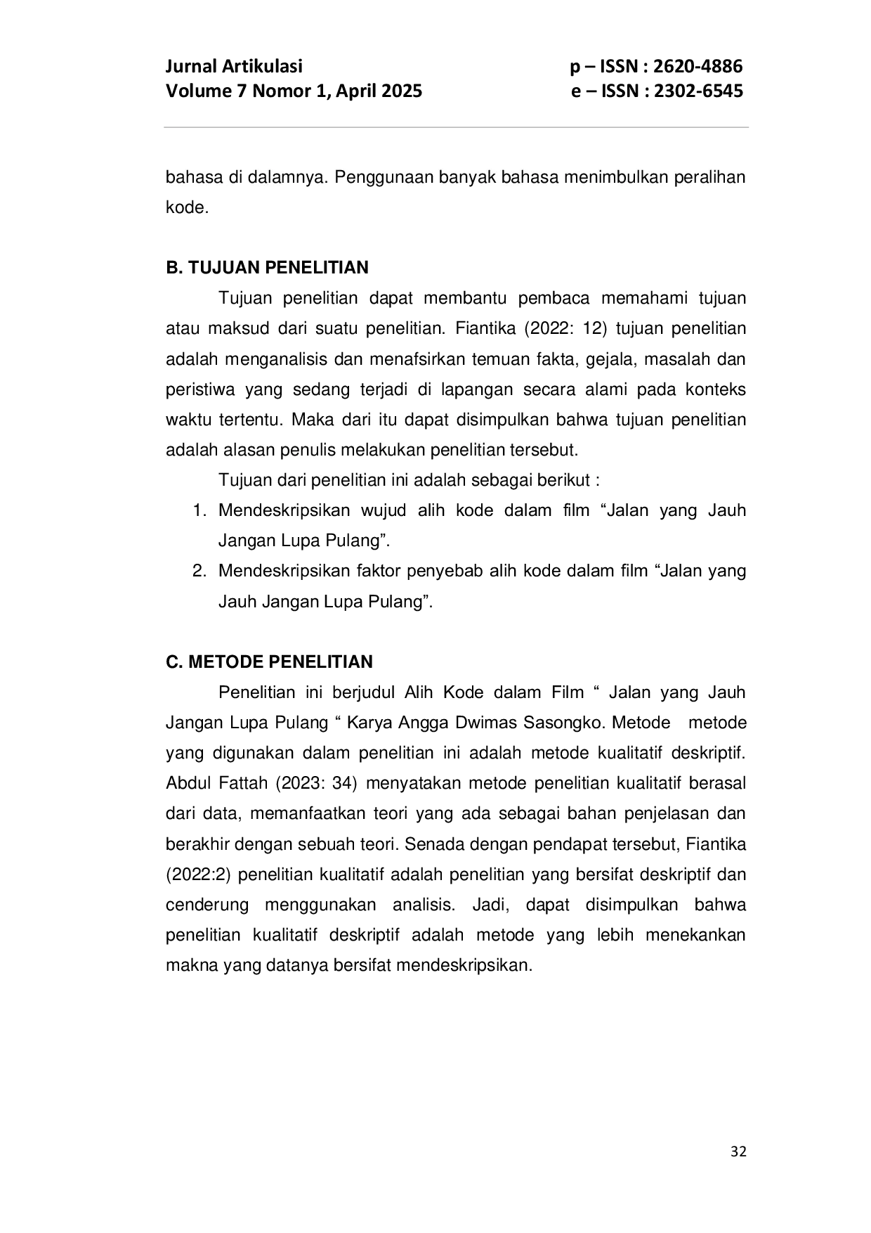 Artikulasi: Jurnal PendidikanArtikulasi: Jurnal PendidikanPenelitian ini bertujuan untuk mengetahui bentuk alih kode yang terdapat dalam film “Jalan yang Jauh Jangan Lupa Pulang karya Angga Dwimas Sasongko. Metode yang digunakan dalam penelitian ini adalah analisis deskriptif. Data dan sumber data yang digunakan adalah alih kode yang terdapat dalam film “Jalan yang Jauh Jangan Lupa Pulang karya Angga Dwimas Sasongko, tahun 2023 berdurasi 1 jam 46 menit. Perusahaan produksi Visinema Pictures, Legacy Pictures, XRM Media. Pengumpulan data pada penelitian ini menggunakan metode simak dengan manggunakan teknik catat. Hasil penelitian yang ditemukan dalam penelitian ini adalah terdapat 17 data alih kode ke luar (external code switching). Faktor penyebab terjadinya alih kode yang terdapat pada film “Jalan yang Jauh Jangan Lupa Pulang yaitu terdapat satu tuturan yang disebabkan oleh penutur, tiga tuturan yang disebabkan oleh lawan tutur, tujuh tuturan yang disebabkan oleh topik pembicaraan, lima tuturan yang disebabkan oleh orang ketiga, dan satu tuturan yang disebabkan oleh sekadar bergengsi.