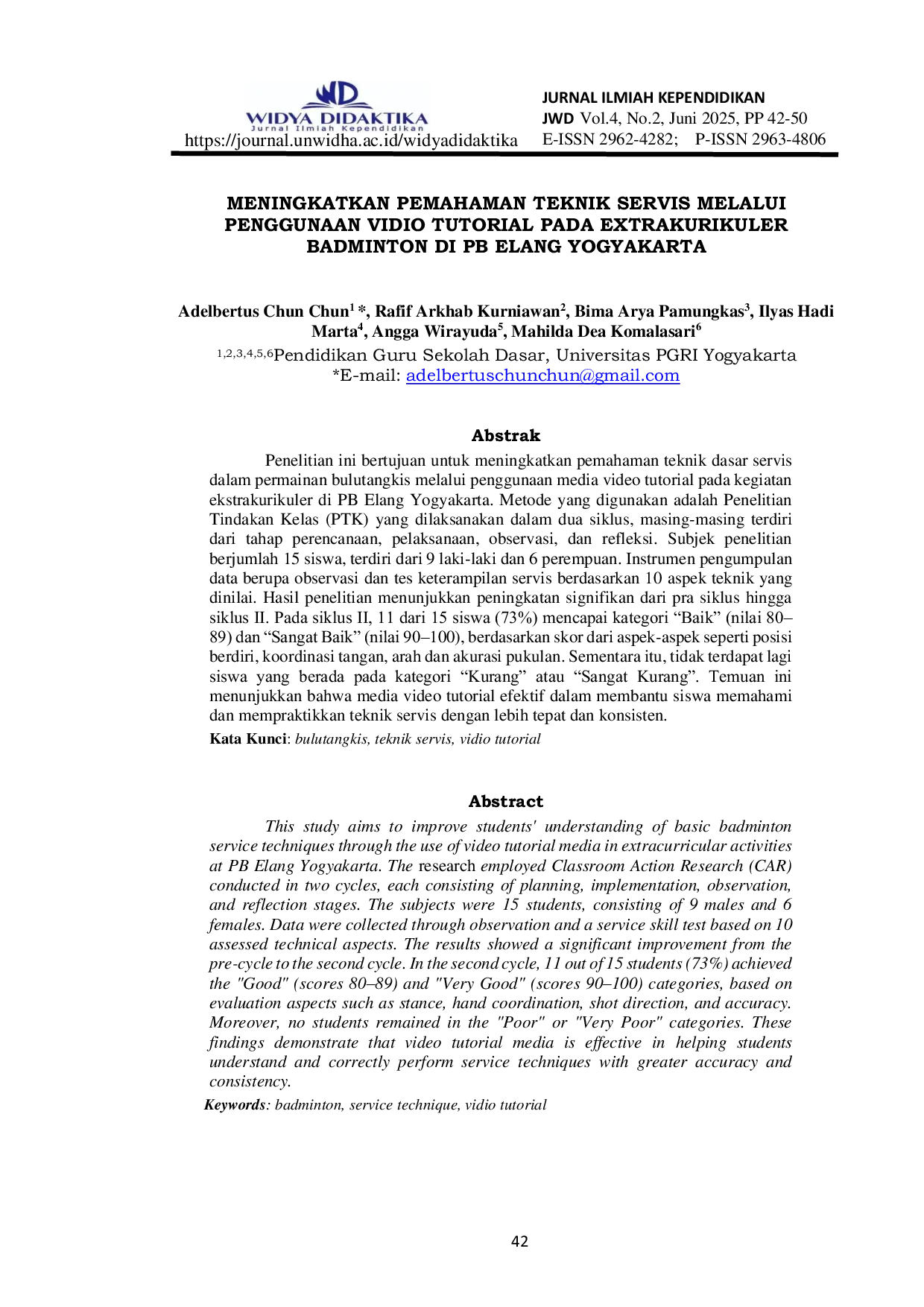 WIDYA DIDAKTIKA - Jurnal Ilmiah KependidikanWIDYA DIDAKTIKA - Jurnal Ilmiah KependidikanPenelitian ini bertujuan untuk meningkatkan pemahaman teknik dasar servis dalam permainan bulutangkis melalui penggunaan media video tutorial pada kegiatan ekstrakurikuler di PB Elang Yogyakarta. Metode yang digunakan adalah Penelitian Tindakan Kelas (PTK) yang dilaksanakan dalam dua siklus, masing-masing terdiri dari tahap perencanaan, pelaksanaan, observasi, dan refleksi. Subjek penelitian berjumlah 15 siswa, terdiri dari 9 laki-laki dan 6 perempuan. Instrumen pengumpulan data berupa observasi dan tes keterampilan servis berdasarkan 10 aspek teknik yang dinilai. Hasil penelitian menunjukkan peningkatan signifikan dari pra siklus hingga siklus II. Pada siklus II, 11 dari 15 siswa (73%) mencapai kategori Baik (nilai 80-89) dan Sangat Baik (nilai 90-100), berdasarkan skor dari aspek-aspek seperti posisi berdiri, koordinasi tangan, arah dan akurasi pukulan. Sementara itu, tidak terdapat lagi siswa yang berada pada kategori Kurang atau Sangat Kurang. Temuan ini menunjukkan bahwa media video tutorial efektif dalam membantu siswa memahami dan mempraktikkan teknik servis dengan lebih tepat dan konsisten.